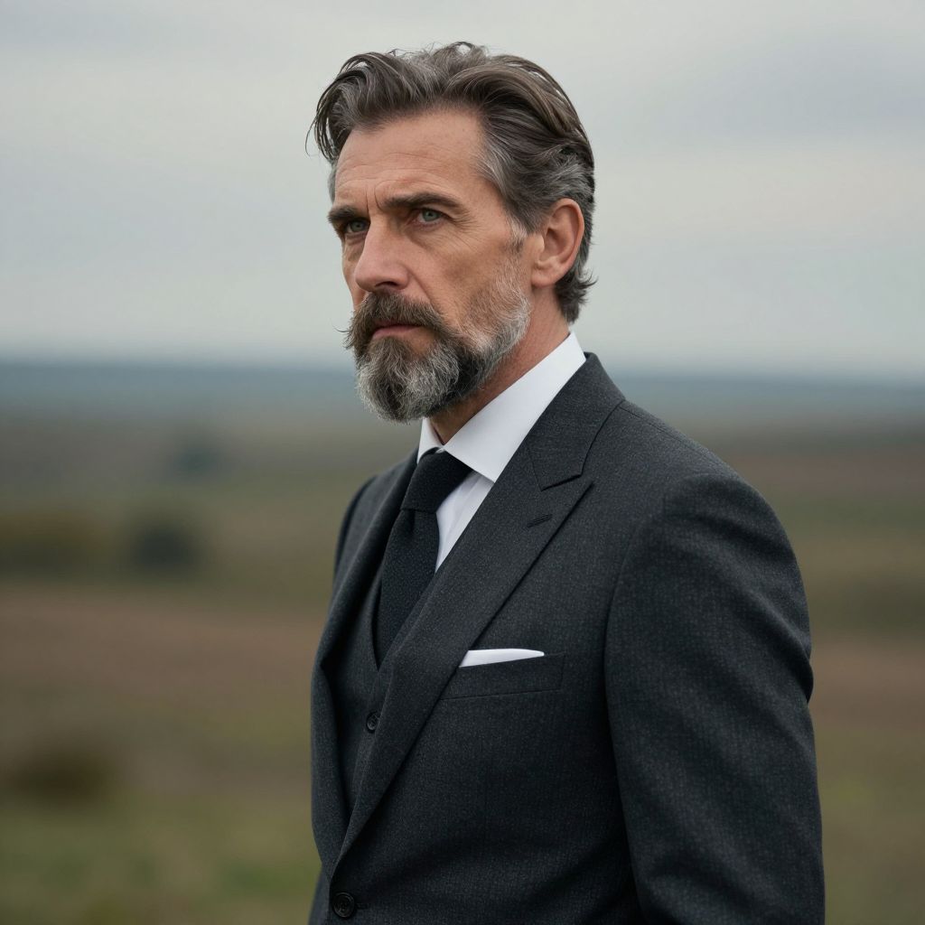Photograph of a middle-aged white man with a rugged, handsome face and gray beard, standing outdoors against a blurred, overcast landscape. He has dark brown, neatly combed hair, and wears a black pinstripe suit with a white dress shirt and black tie. A white pocket square peeks out from his suit jacket. His expression is serious and contemplative, with his head slightly turned to his right. The lighting is natural, highlighting his facial features and the texture of his suit. The background is a soft, out-of-focus mix of green and brown fields, indicating a rural setting.
