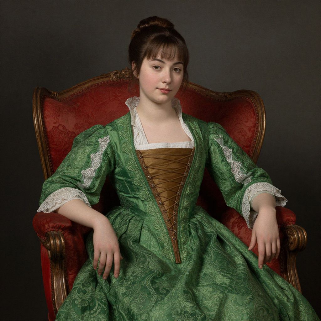 Photograph of a young Caucasian woman with fair skin and dark brown hair styled in an updo, seated in an ornate, red velvet armchair with gold trim. She wears a green, 18th-century style gown with intricate lace detailing, brown lace-up corset in the center, and white lace trim on the sleeves and neckline. Her expression is calm, with a slight, closed-mouth smile. The background is a plain, dark gray wall, emphasizing the subject and her elaborate attire. The lighting is soft, highlighting the texture of her dress and the richness of the chair.