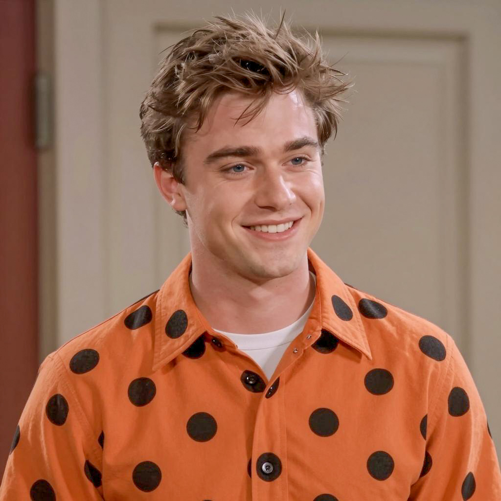Side profile of a young blonde man with fair skin wearing a red sweater over a white collared shirt. He has a slight smile and is looking slightly downward. Background features a patterned curtain with alternating orange and black circular dots on a white backdrop, alongside a plain brown wall.