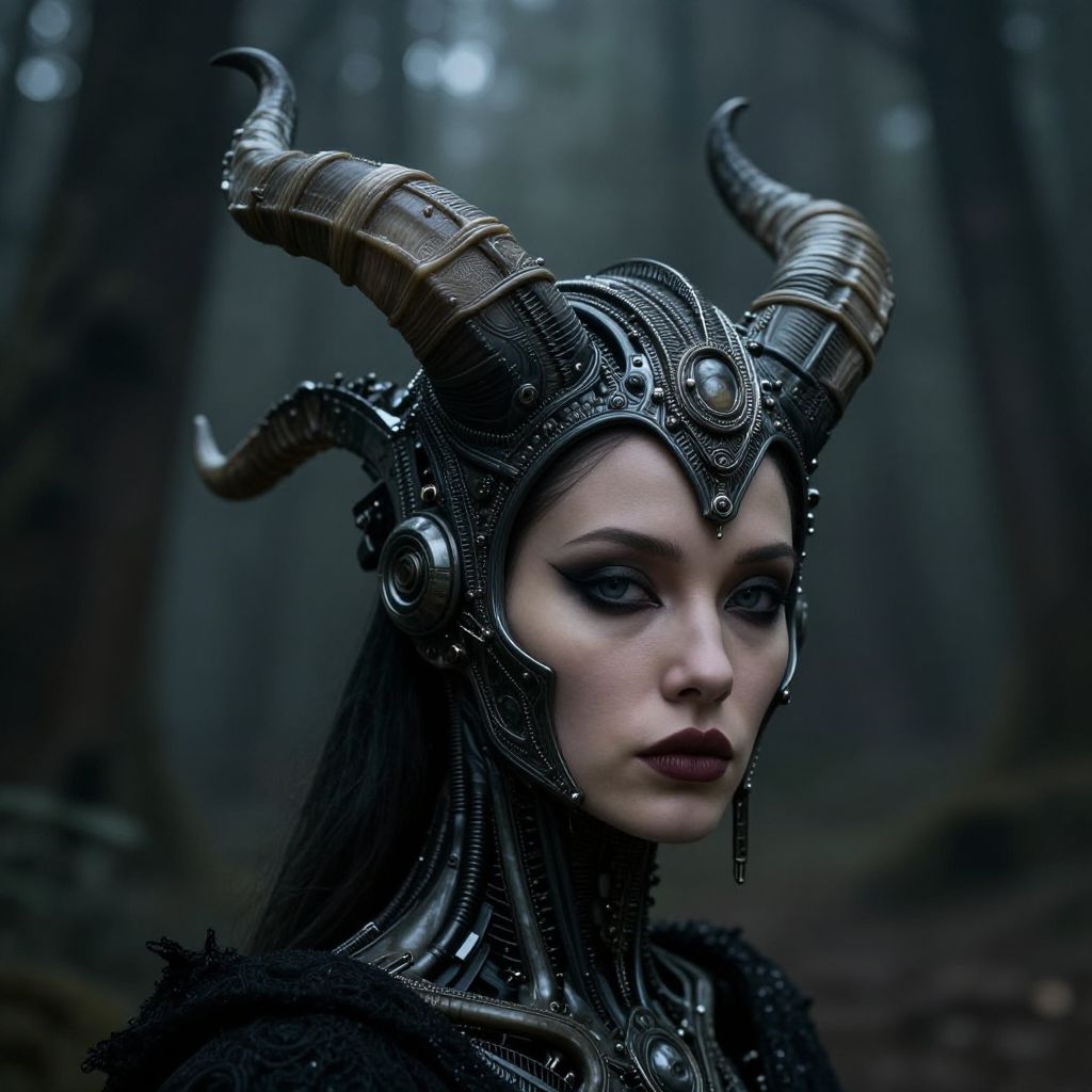 A striking digital portrait of a woman adorned with an intricate biomechanical headdress featuring elaborate coiled horns and detailed textures. Set against a misty, dark forest backdrop, the image blends elements of gothic and sci-fi art styles to create a surreal and otherworldly atmosphere.