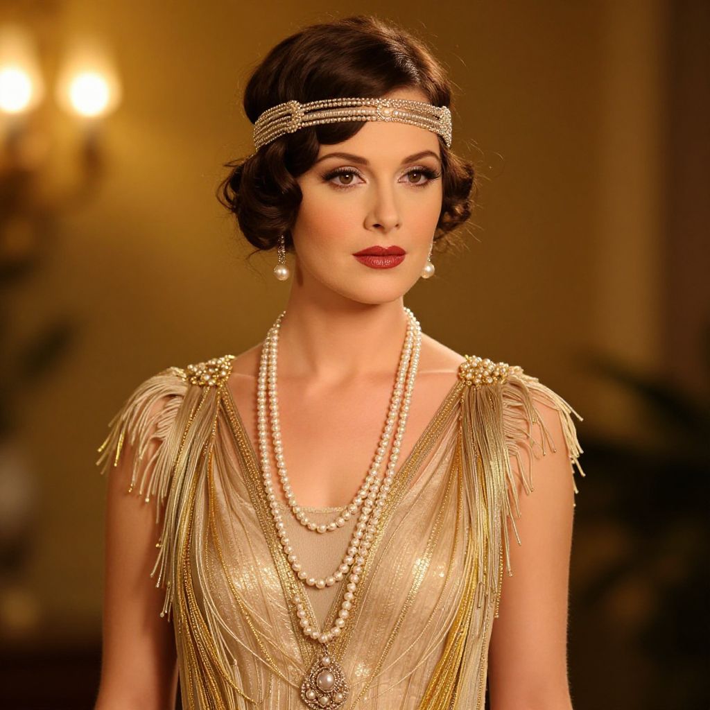 Photograph of a smiling woman with fair skin and wavy, light brown hair, adorned in a black mesh cloche hat and a sleeveless, dark gray dress. She wears a delicate gold necklace. The background is a blurred urban street scene with people, buildings, and cars, suggesting a vintage or 1920s-style setting. Her bright red lipstick contrasts with her soft features and the muted colors of her attire. The image has a soft focus effect, enhancing the nostalgic, timeless feel.