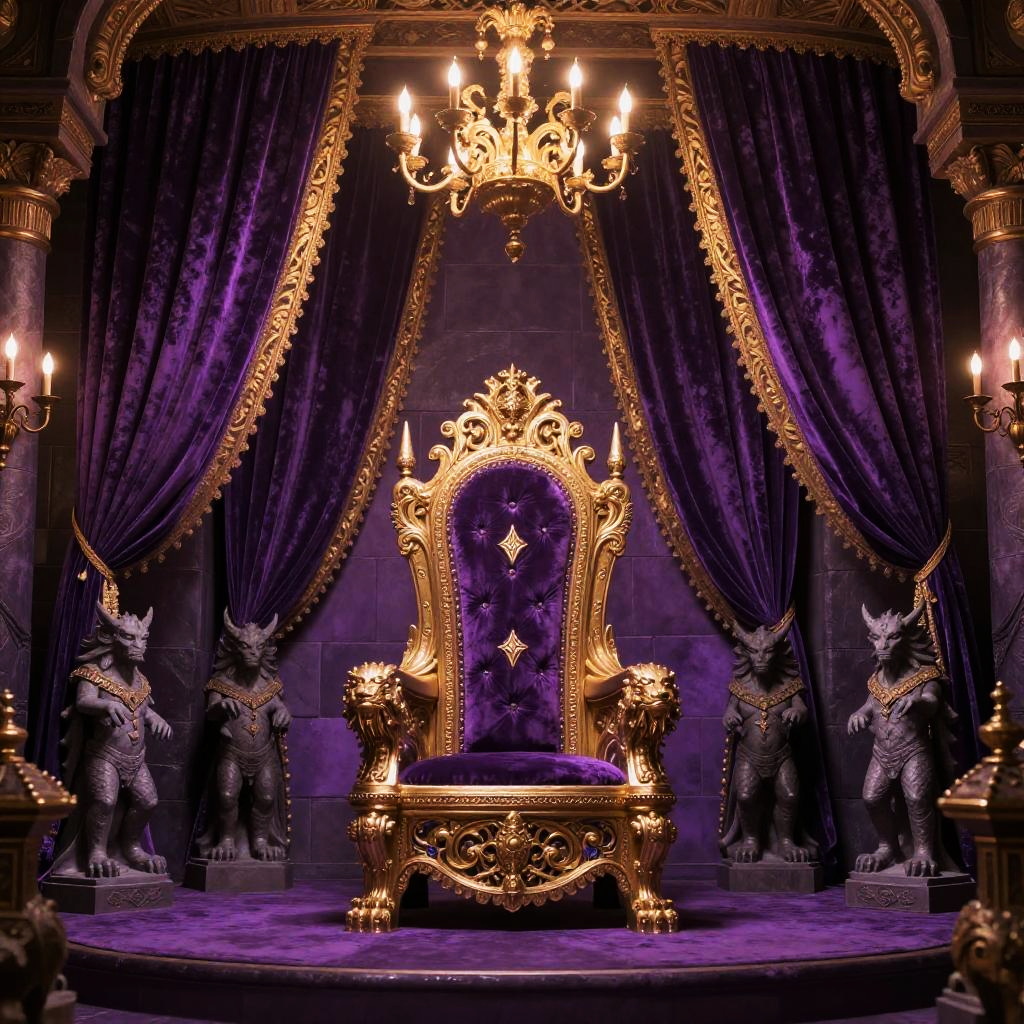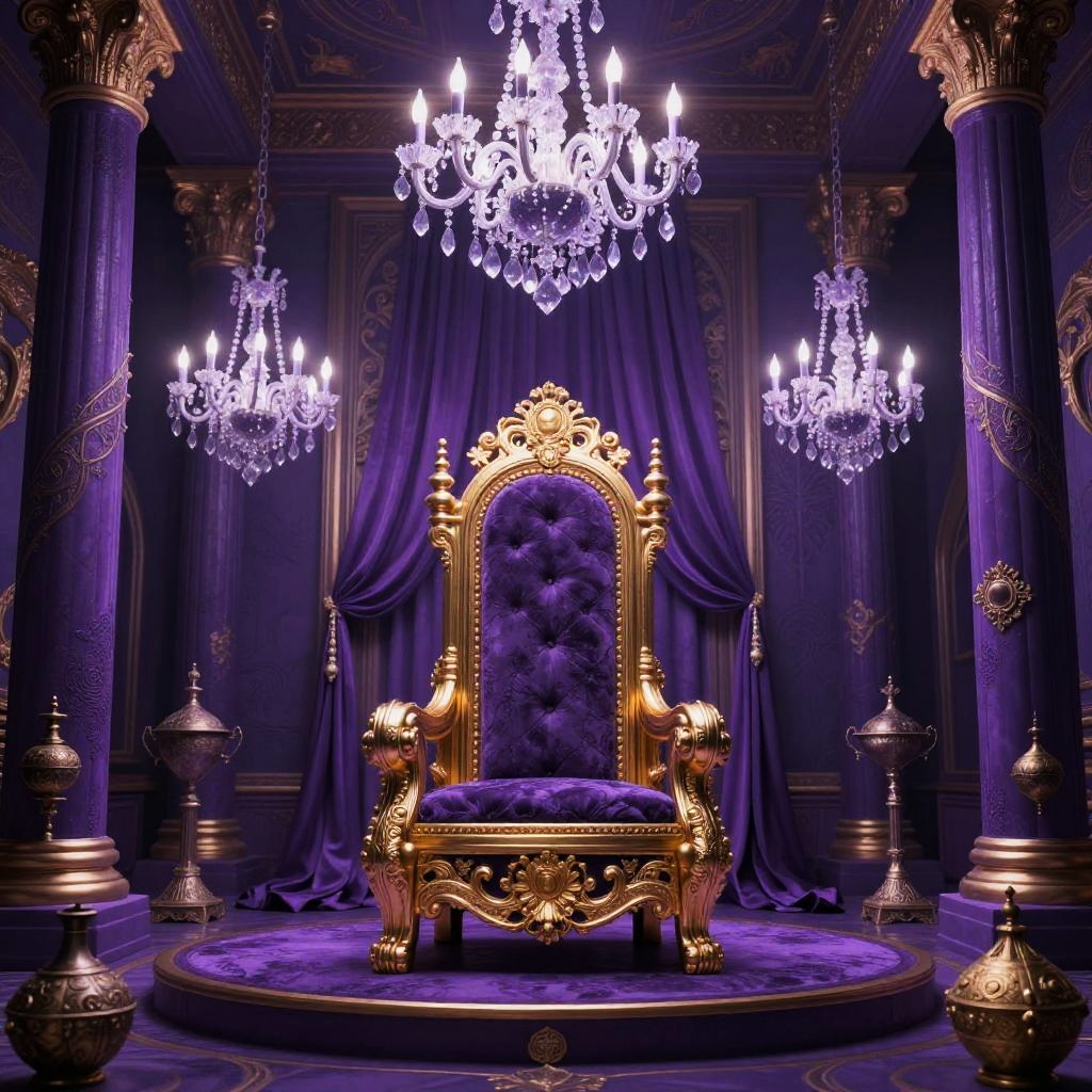 Opulent purple throne room adorned with rich silk tapestries and towering columns, crystal chandeliers glistening with lavender light, a regal throne carved from deep purple stone with gold accents, surrounded by ancient artifacts, surreal and mystical atmosphere.