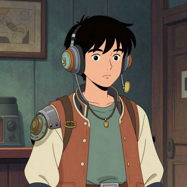 A 2D stylized and simplified portrait of a young male character named Piston, inspired by dieselpunk aesthetics. He wears a headset with a microphone, a casual green shirt under a brown and beige jacket with mechanical shoulder details, and a pendant necklace. The background shows an indoor setting with muted tones, fitting the dieselpunk and scoutcore style.
