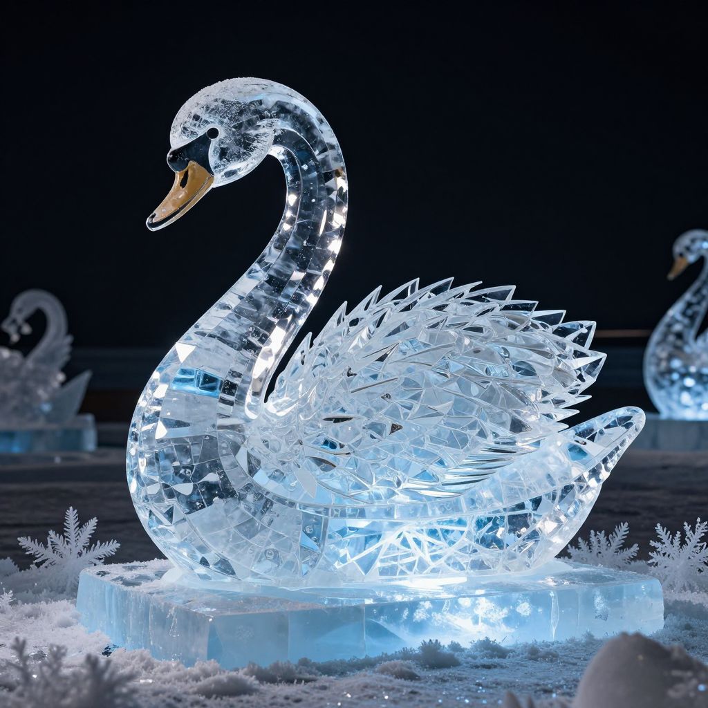 Chisled ice sculpture of an elegant swan, crystal clear textures with precise sharp edges, glowing blue light from beneath, surrounded by frost and snowflakes, cold arctic ambiance, ultra detailed frozen art piece