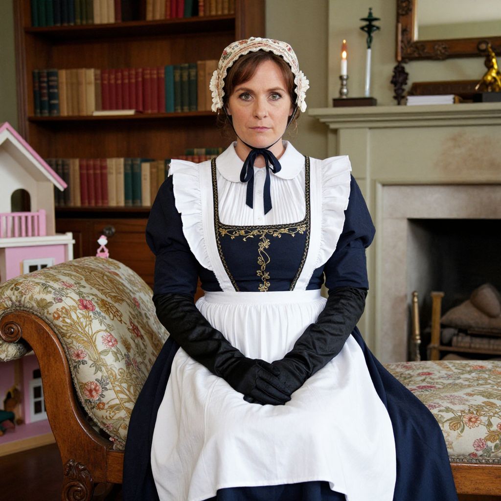A well-lit, naturalistic photo of a woman in her 40s wearing a full Victorian nanny costume – including a starched white apron, a dark blue bodice with gold embroidery, black gloves, and a bonnet with a floral pattern – sitting on a wooden chaise longue in a cozy, historically accurate Victorian home with bookshelves, a fireplace, and a dollhouse in the background, with her face showing a kind, serious expression and warm lighting. The woman has big tits and cute face