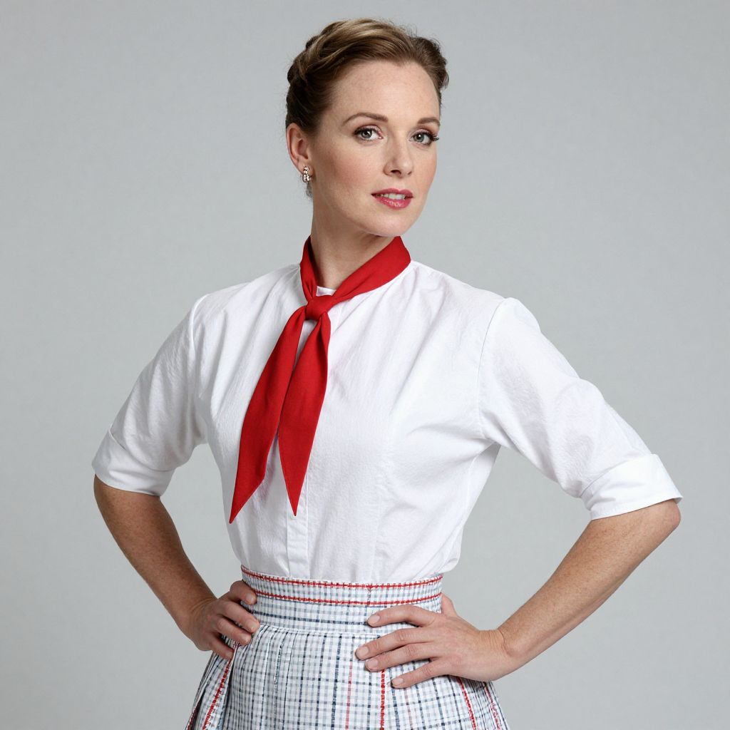 Photograph of a Caucasian woman with fair skin and brown hair styled in a vintage updo. She has light makeup with pink lipstick and is wearing a white, short-sleeved blouse with a bright red necktie. Her skirt is high-waisted, white, and checks with red and black lines. She stands against a plain light gray background, with her hands on her hips and a confident smile. The image has a clean, retro style, reminiscent of 1950s fashion. The woman's attire and pose convey a classic, vintage aesthetic.