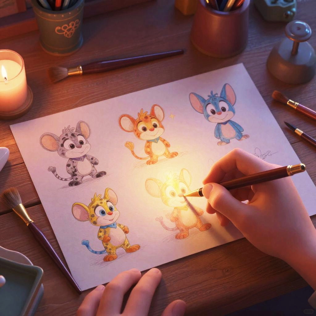 Disney character creator concept, a whimsical digital art scene showing an animated workshop filled with colorful sketches, magical brushes, and glowing character designs taking shape under soft warm lighting, ultra detailed, vibrant colors