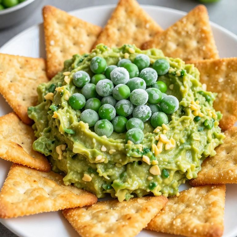Arrangement of vibrant green guacamole topped with fresh frozen peas, surrounded by triangular cheese crackers on a white plate, creating a colorful and appetizing snack display.