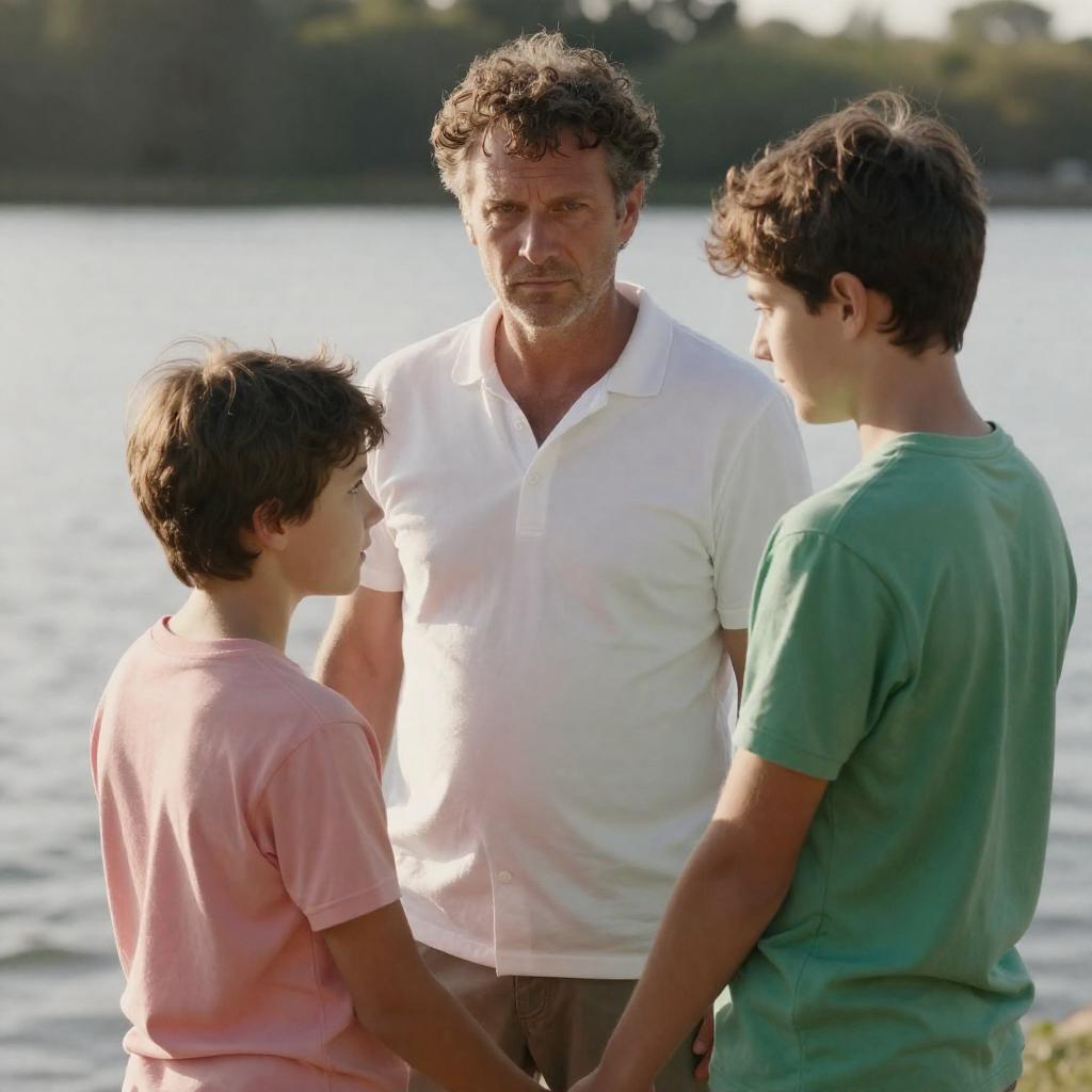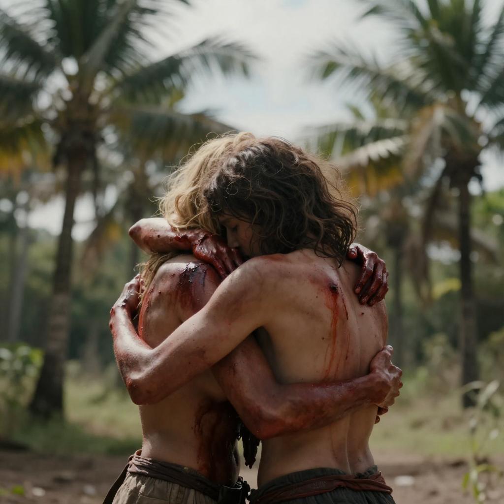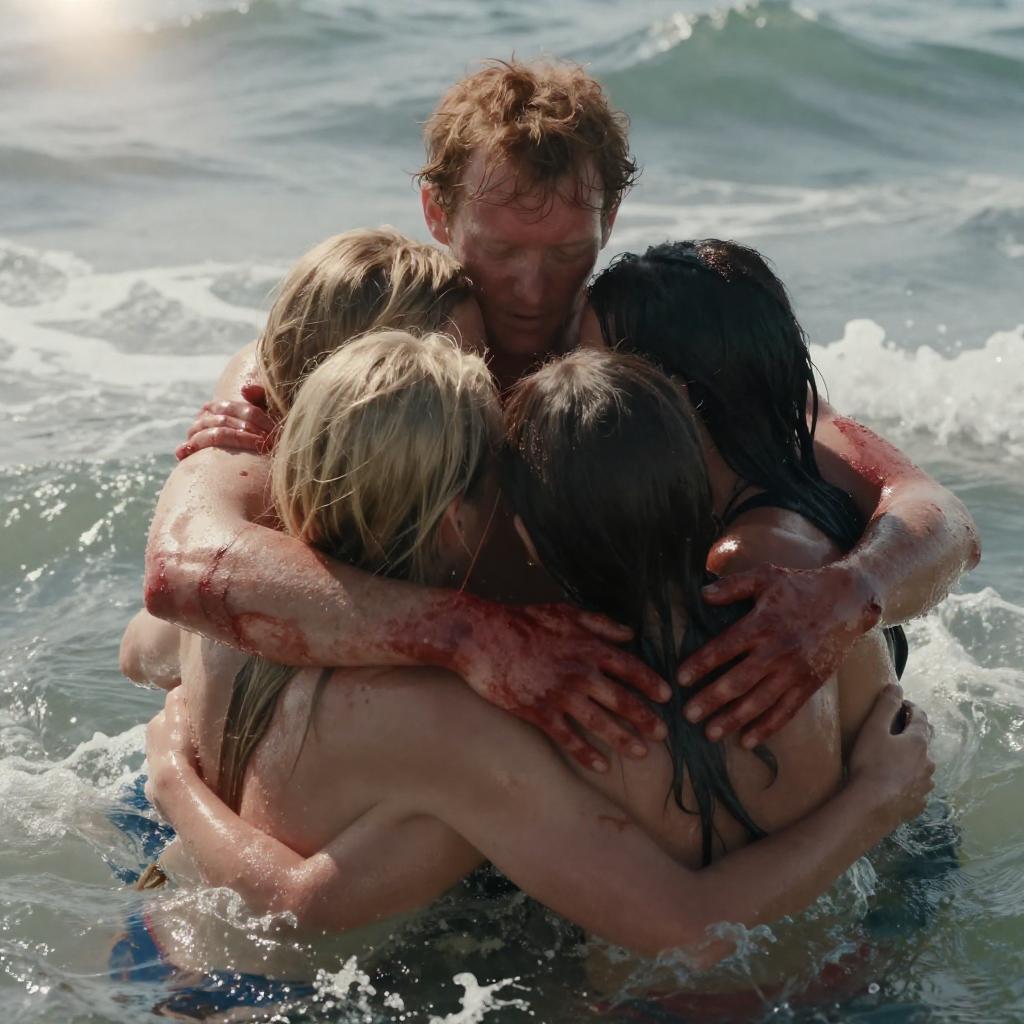 Photograph of four people hugging tightly in a turbulent, foamy sea. The man in the center, with reddish-brown hair and bloodied arms, holds two blond-haired individuals, one in front and one behind, and another person with darker hair. All faces are obscured by hair. Bright sunlight shines from the top left.