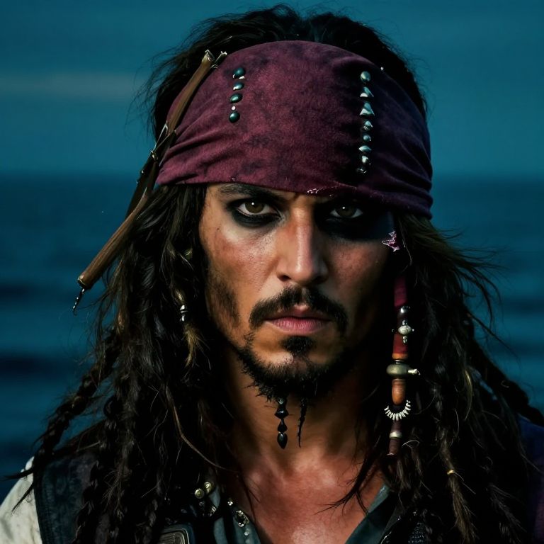 Photograph of a rugged pirate with a medium close-up shot. He has dark, unkempt hair, a thick mustache, and intense, piercing eyes. He wears a maroon bandana adorned with small silver studs and has long, braided hair with beads and feathers. His skin is tanned and slightly weathered. The background is a blurred, deep blue ocean, suggesting a nighttime sea setting. His expression is stern and focused. He wears a white shirt with a black vest, typical of pirate attire. The lighting highlights his facial features, casting shadows that add to his intense look.