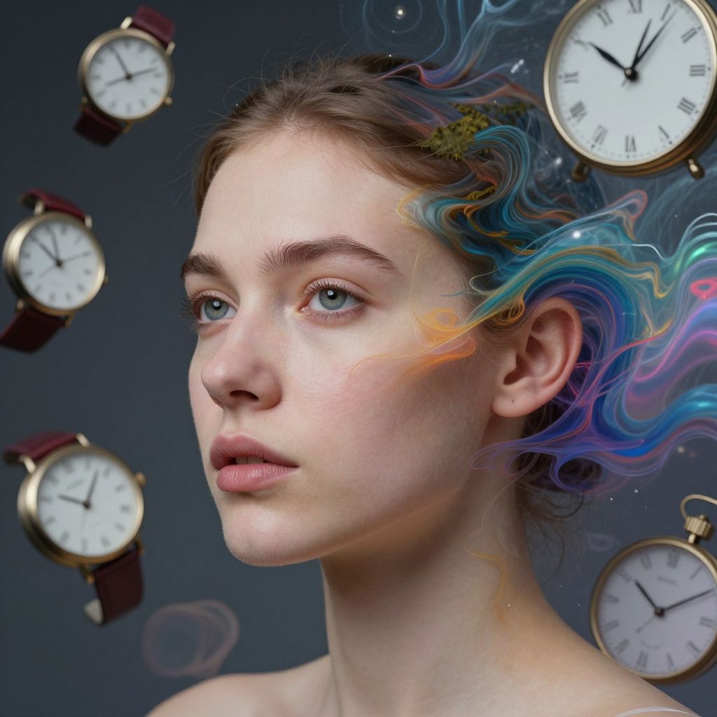 A digitally created, surreal portrait of a young woman with fair skin and blue eyes. She has brown hair partially covered by swirling, multicolored smoke-like patterns. Her expression is calm, with slightly parted lips. Surrounding her head are several floating, vintage-style wristwatches with white faces and black numbers, some partially visible. The background is a dark gradient, enhancing the ethereal, dreamlike quality of the image. The woman's neck is bare, suggesting she is unclothed. The overall style combines realistic portraiture with fantasy elements, creating a whimsical, otherworldly atmosphere.