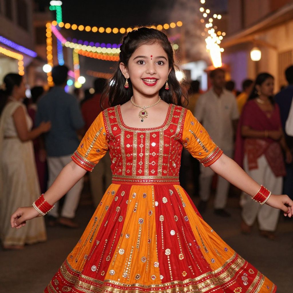 Photograph of a young Indian woman in a vibrant orange and red traditional lehenga, adorned with gold embroidery, dancing at a festive night street celebration with