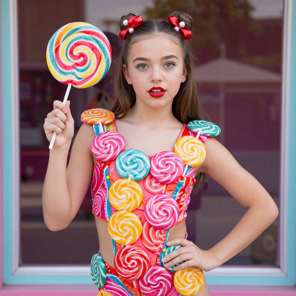 A close-up portrait of a teenager wearing a lollipop dance costume with a full-body suit made of candy-colored fabrics, each piece resembling a lollipop, standing confidently in front of a retro 80s themed store window, her face showing confidence and charm, with natural makeup, a bold red lip, and sparkling eyes.
