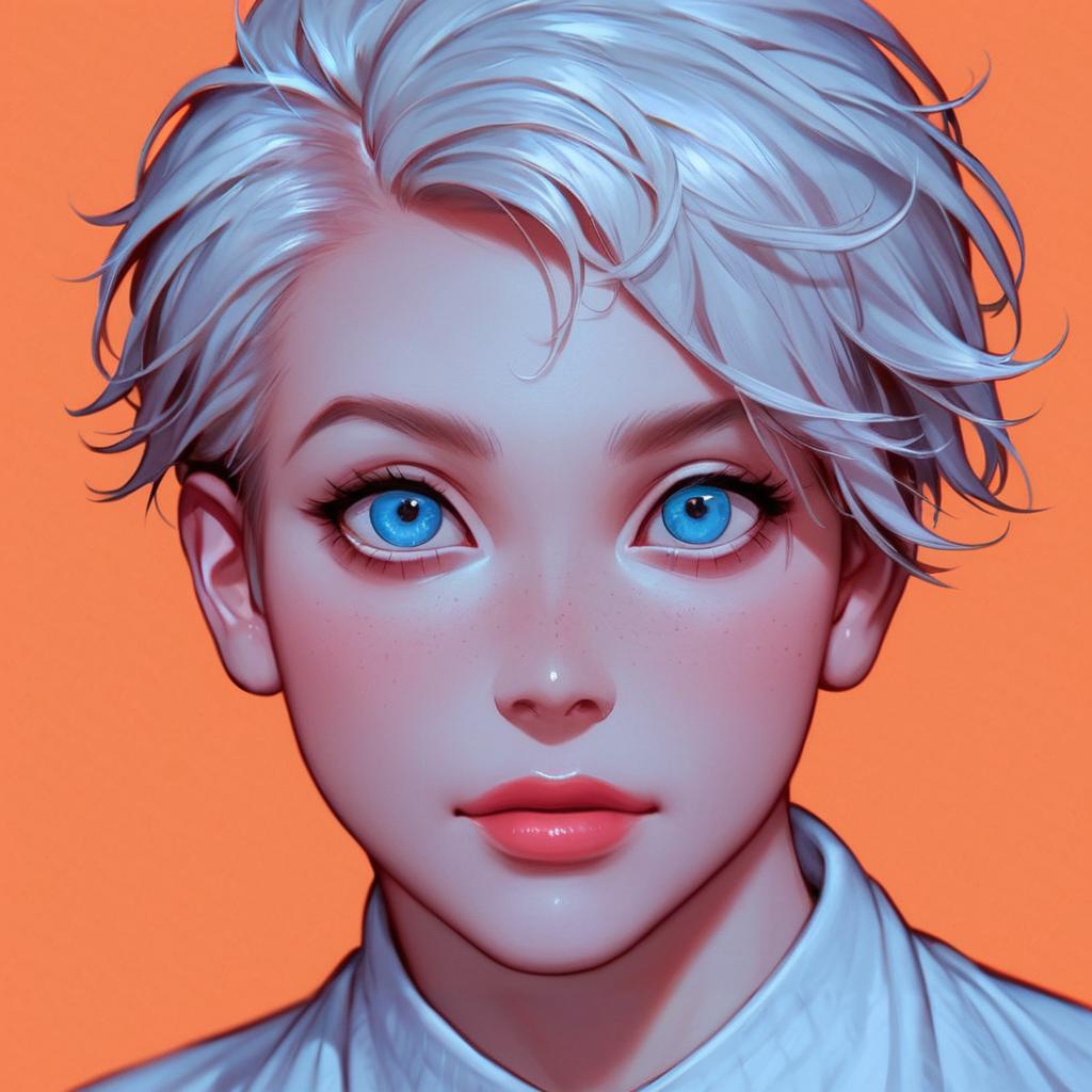 Digital portrait of an energetic Caucasian man with scruffy facial hair and lively deep-set blue eyes. The man has light brown hair, groomed beard, and full lips with a subtle shine. He is looking directly at the viewer against a vibrant orange background, wearing a dark shirt.