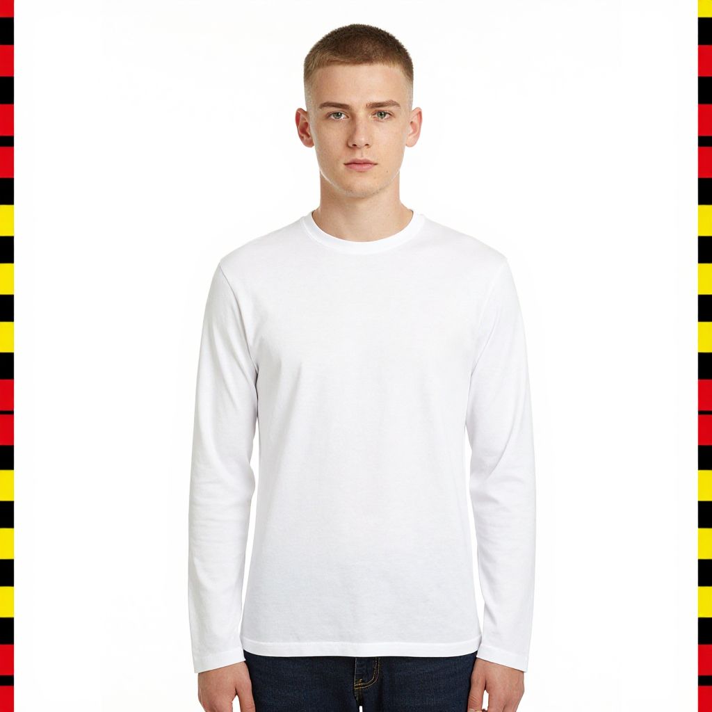 Photograph of a young, Caucasian man with short, light brown hair and a clean-shaven face. He's wearing a plain white long-sleeve shirt and dark blue jeans. The background is stark white with a small, colorful border on the sides, featuring red, yellow, and black stripes. He stands with a neutral expression, looking directly at the camera.