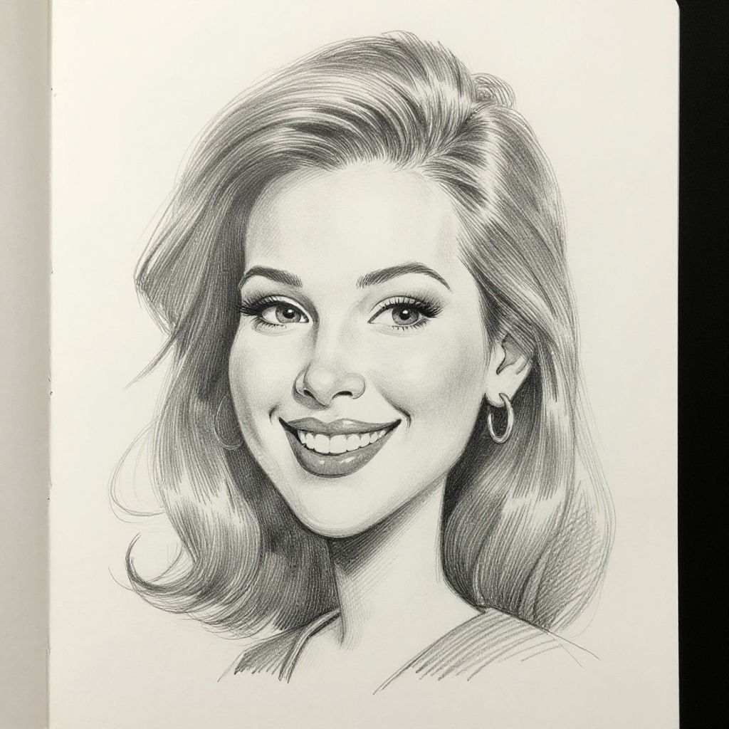 Detailed black-and-white pencil drawing of a smiling young woman with wavy hair, hoop earrings, and a confident expression.