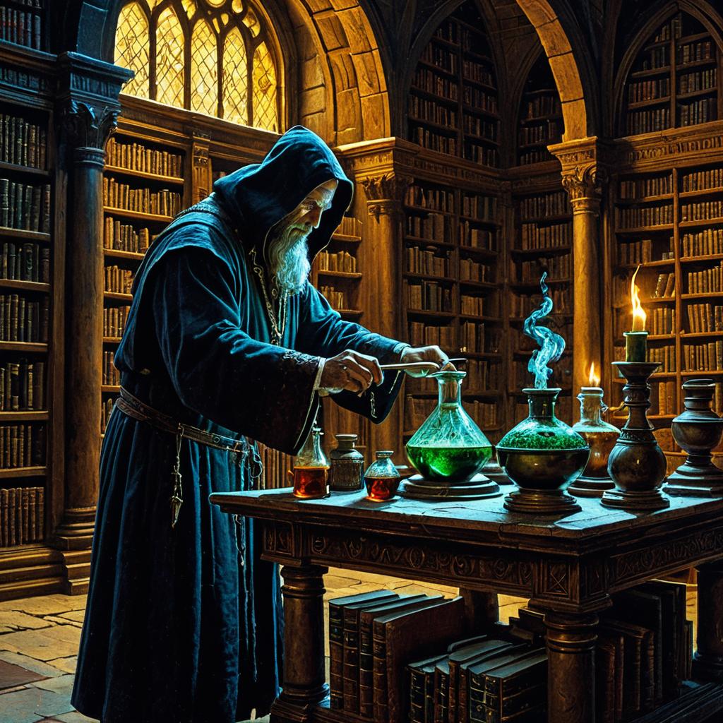 Concept art of the Alchemist mixing potions through an Ancient Library. Highly detailed, with dramatic lighting by James Gurney, Donato Giancola.