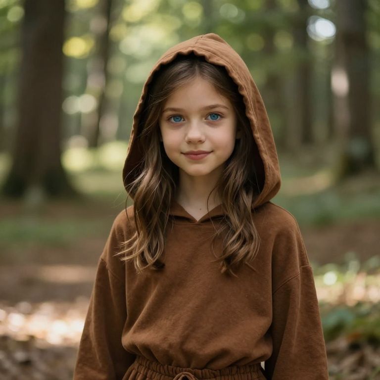 A girl with brown hair and bright blue eyes stands in a softly lit forest clearing, wearing a cozy brown outfit with a hood that gently covers her shoulders. The hood is slightly pulled up, revealing just a hint of her face, and her brown hair falls in soft waves over her shoulders. She has a gentle, calm expression, with a subtle smile, and the natural light filters through the trees, casting dappled shadows on the ground. The atmosphere is peaceful and serene, with a touch of magic in the air.