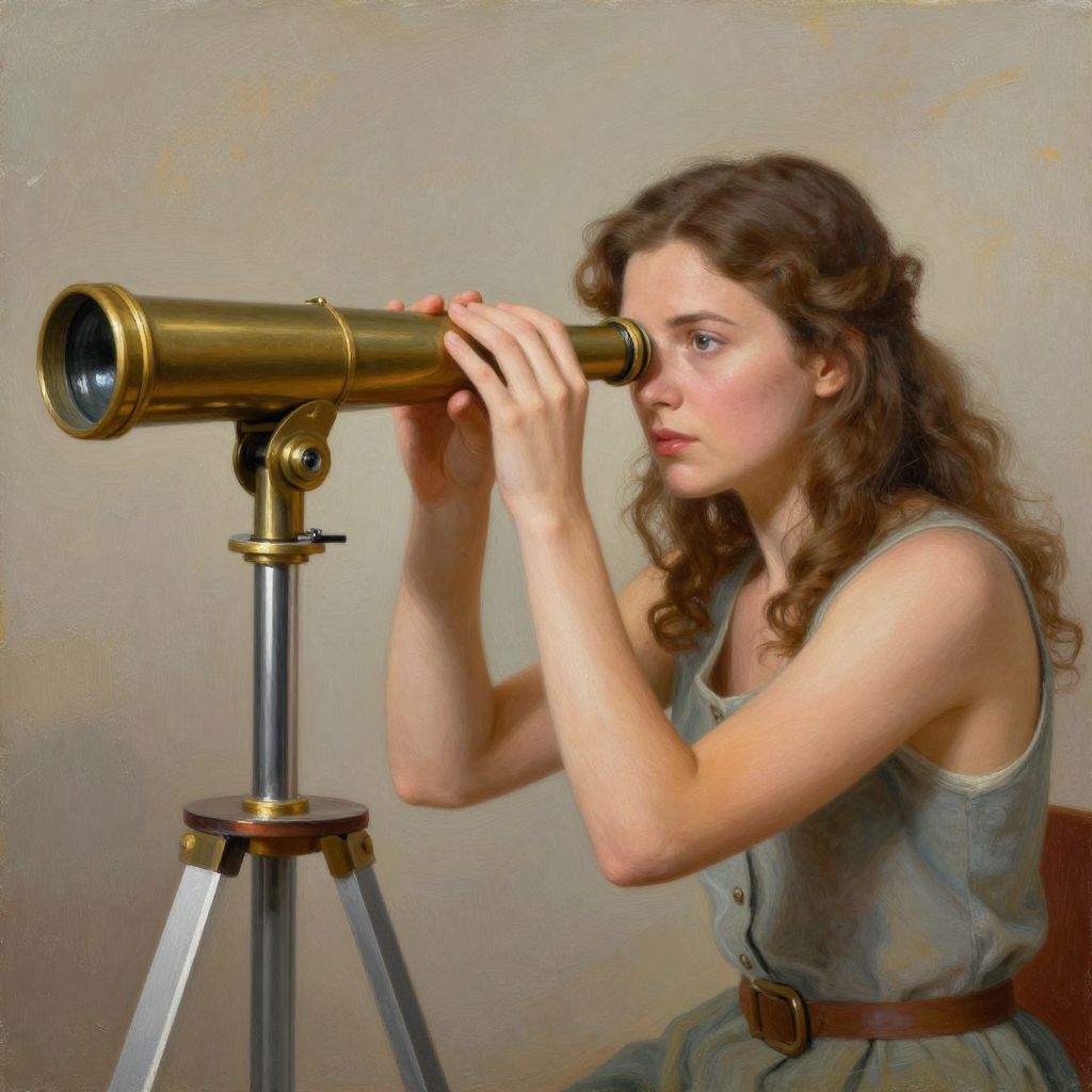 A digitally painted image of a young woman with fair skin and wavy brown hair, wearing a sleeveless, light green dress with a brown belt. She is intently looking through a brass telescope mounted on a tripod, holding the eyepiece with both hands. Her expression is focused and her blue eyes gaze forward. The background is a plain, beige wall, adding to the classical, serene atmosphere. The painting style is realistic with soft, smooth textures and gentle lighting, emphasizing the woman's delicate features and the metallic sheen of the telescope.