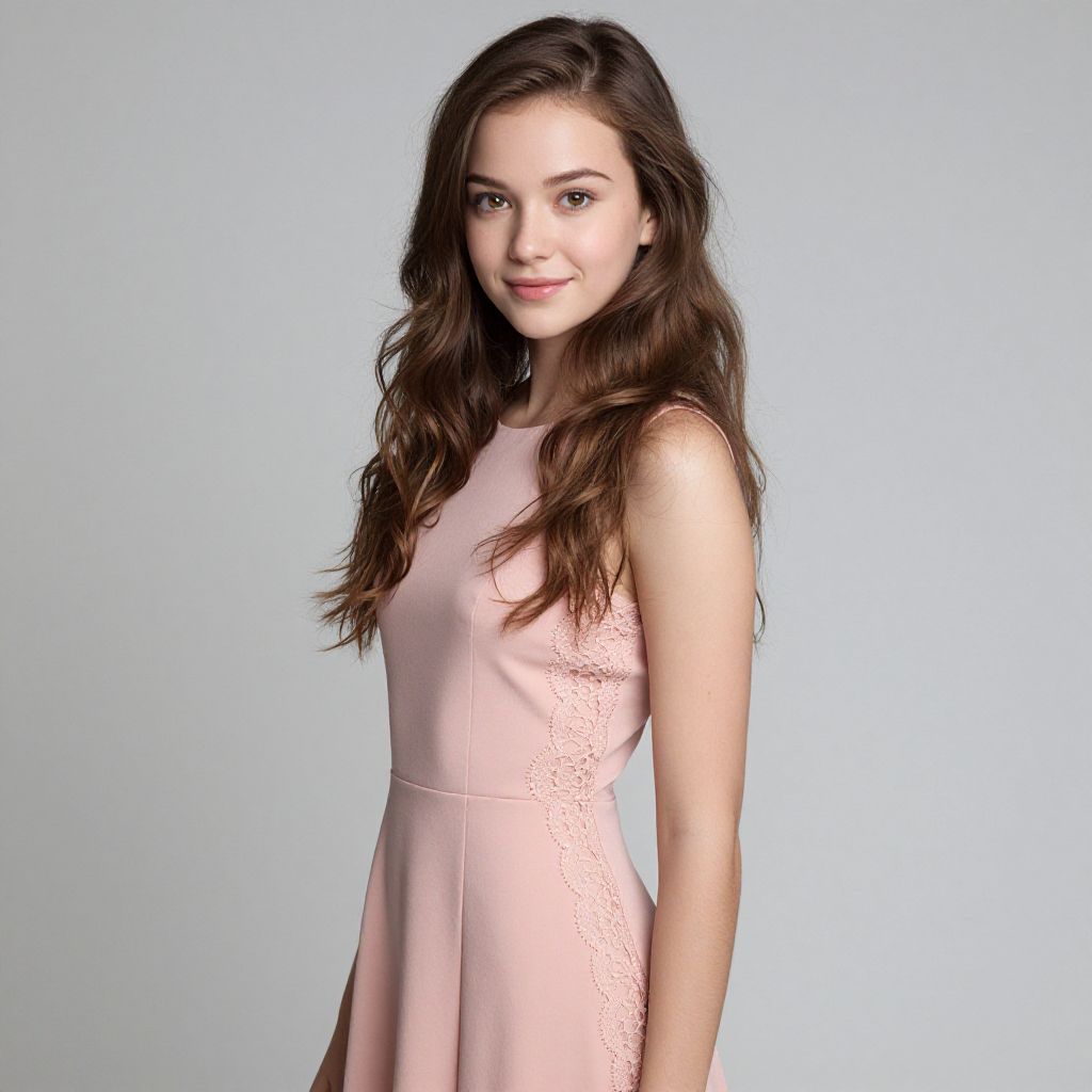 A young woman with long wavy hair wearing a vintage-inspired red dress with white buttons and a white collar stands against a wooden wall background. The soft lighting highlights her serene expression and the warm tones emphasize a rustic, timeless aesthetic.