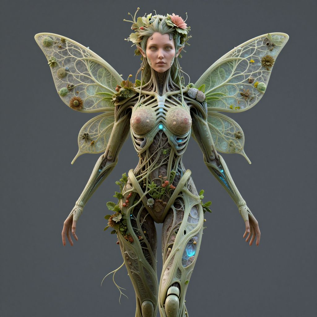 Digital artwork of a fairy-like woman with translucent wings adorned with flowers, wearing a leafy, biomechanical bodysuit, against a dark gray