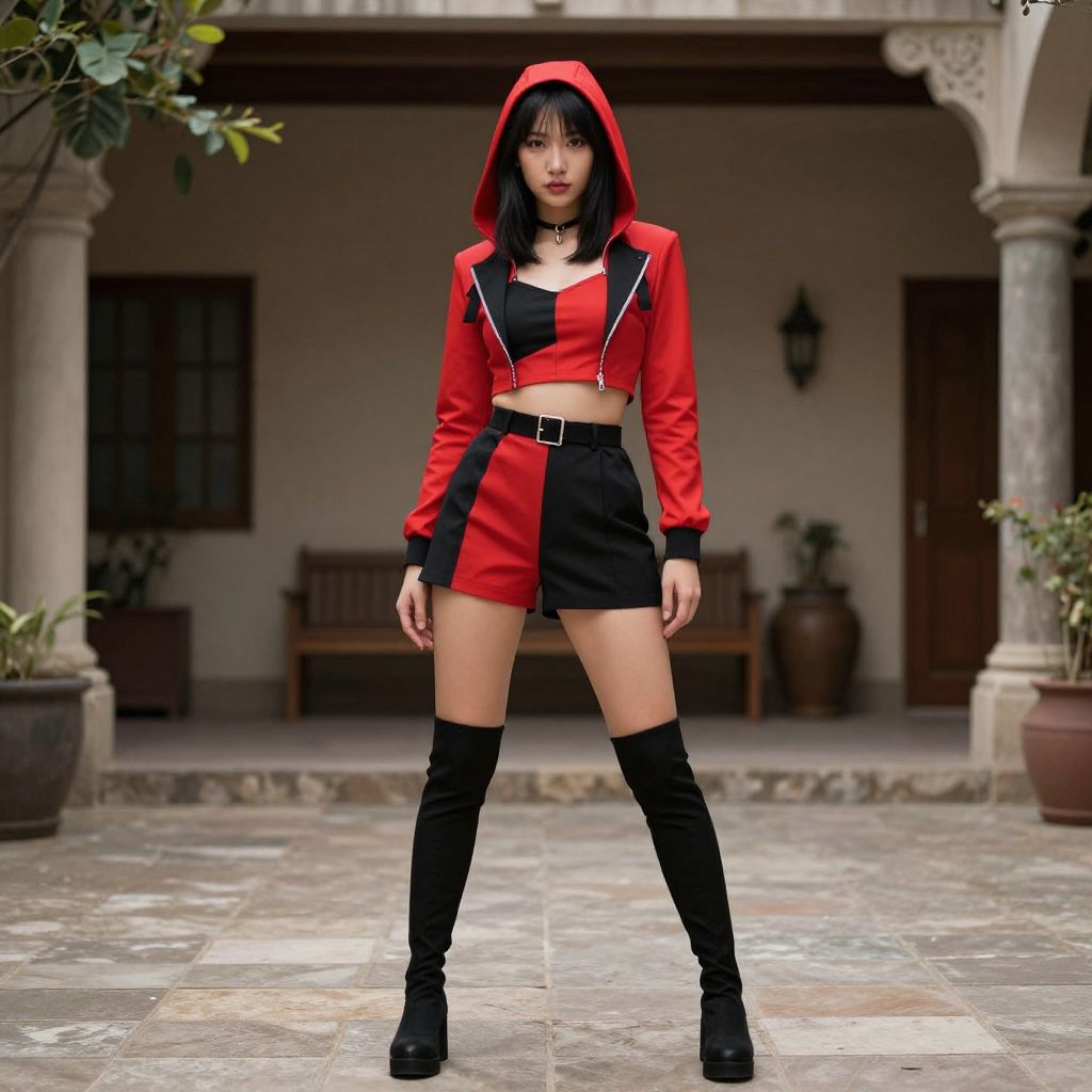 Red Black Costume, woman in a red and black outfit standing in a courtyard