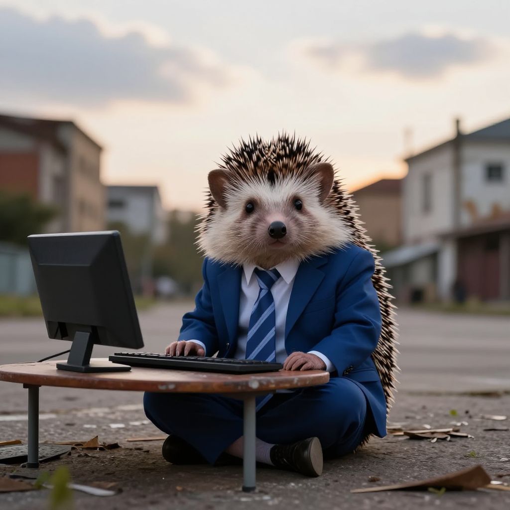 Surreal image of an anthropomorphic hedgehog dressed in a formal blue suit and striped tie, sitting cross-legged with a computer keyboard on a low table in a decayed urban plaza during late afternoon. The hedgehog character appears focused, blending mundane office work with a fantasy animal head against a backdrop of worn buildings and soft, cloudy illuminated sky.