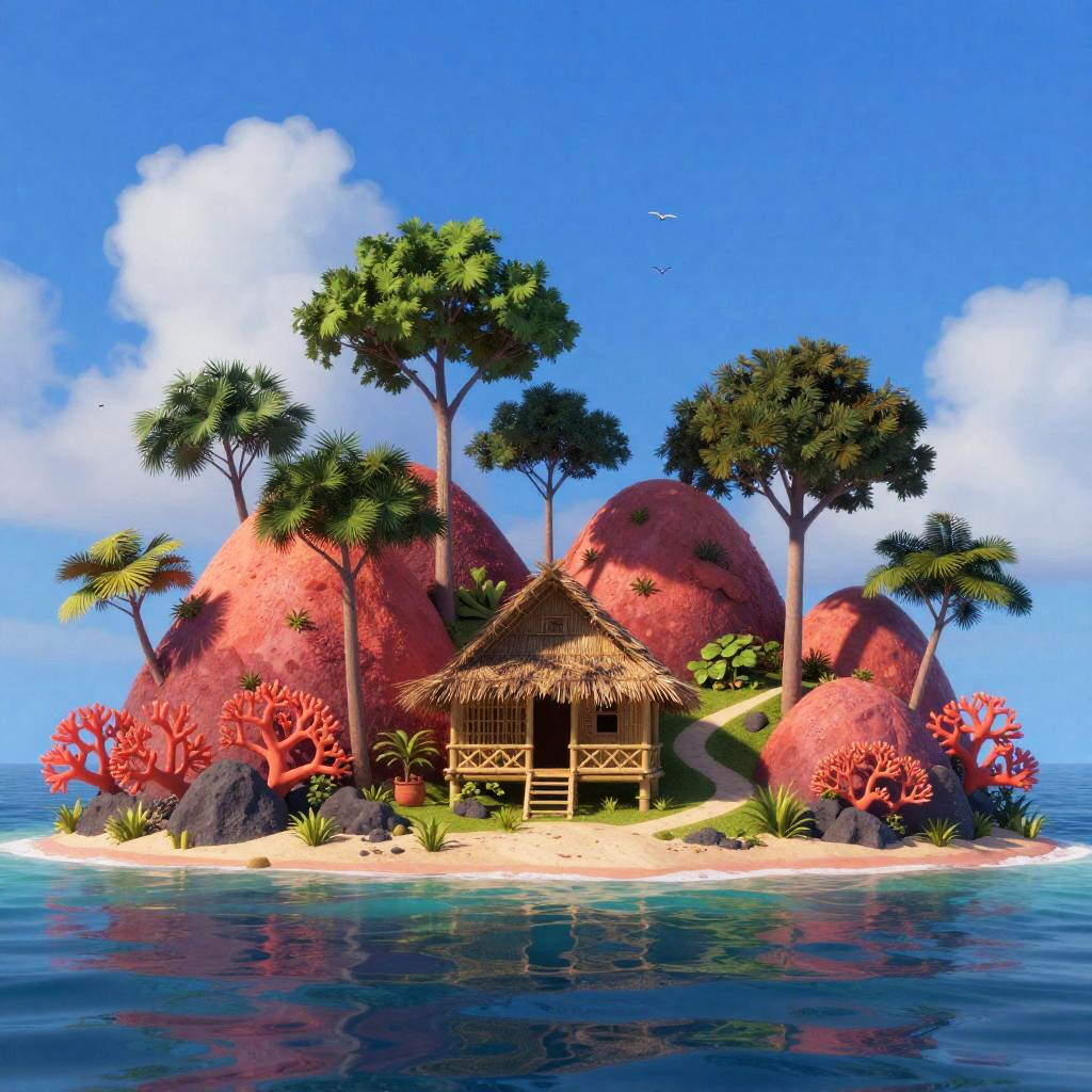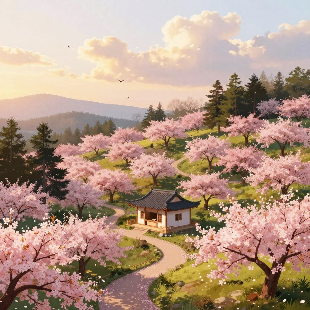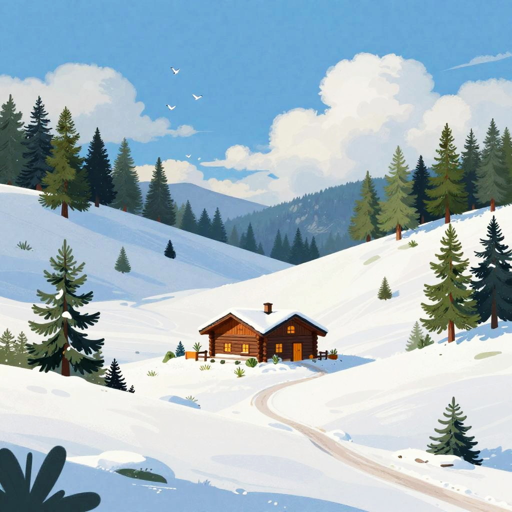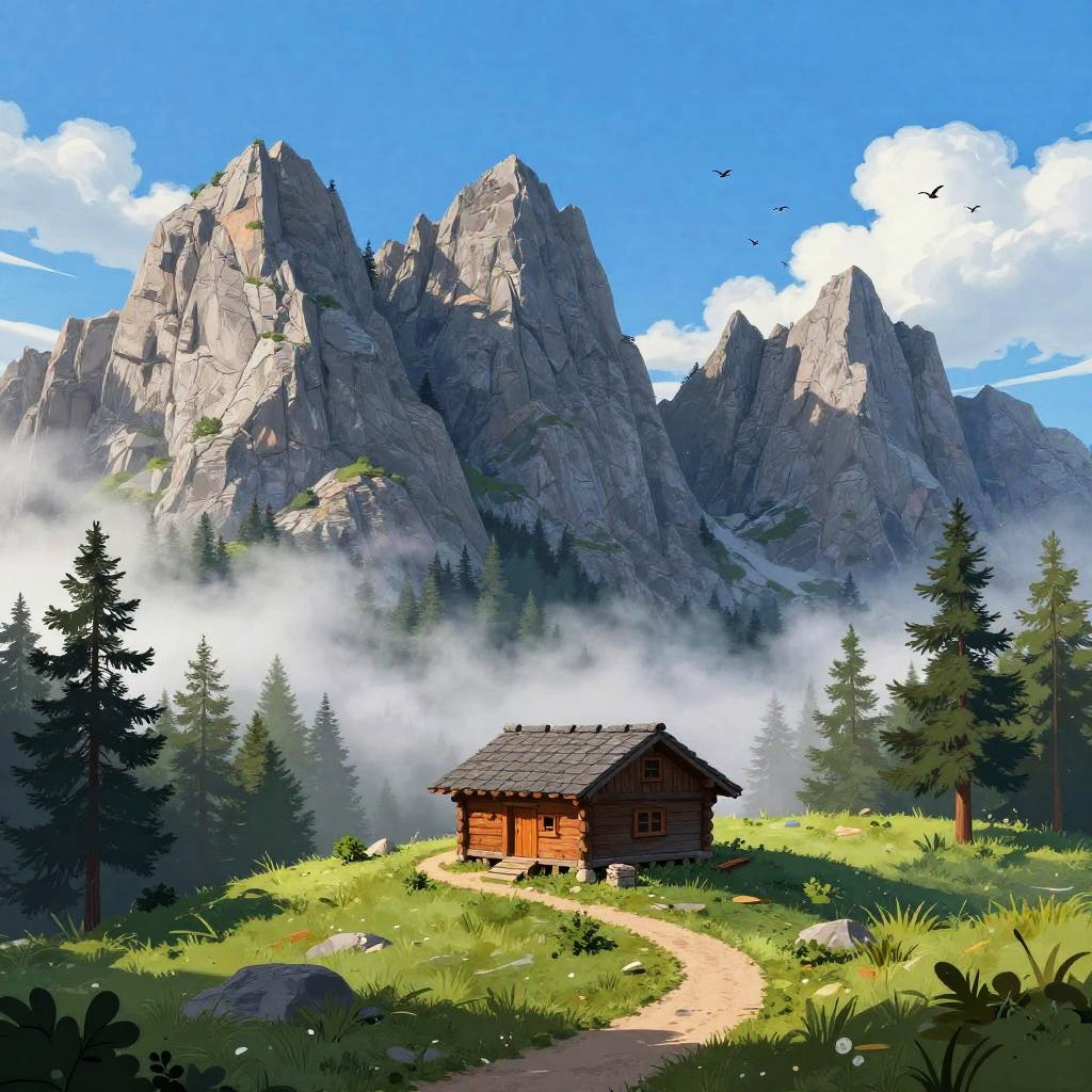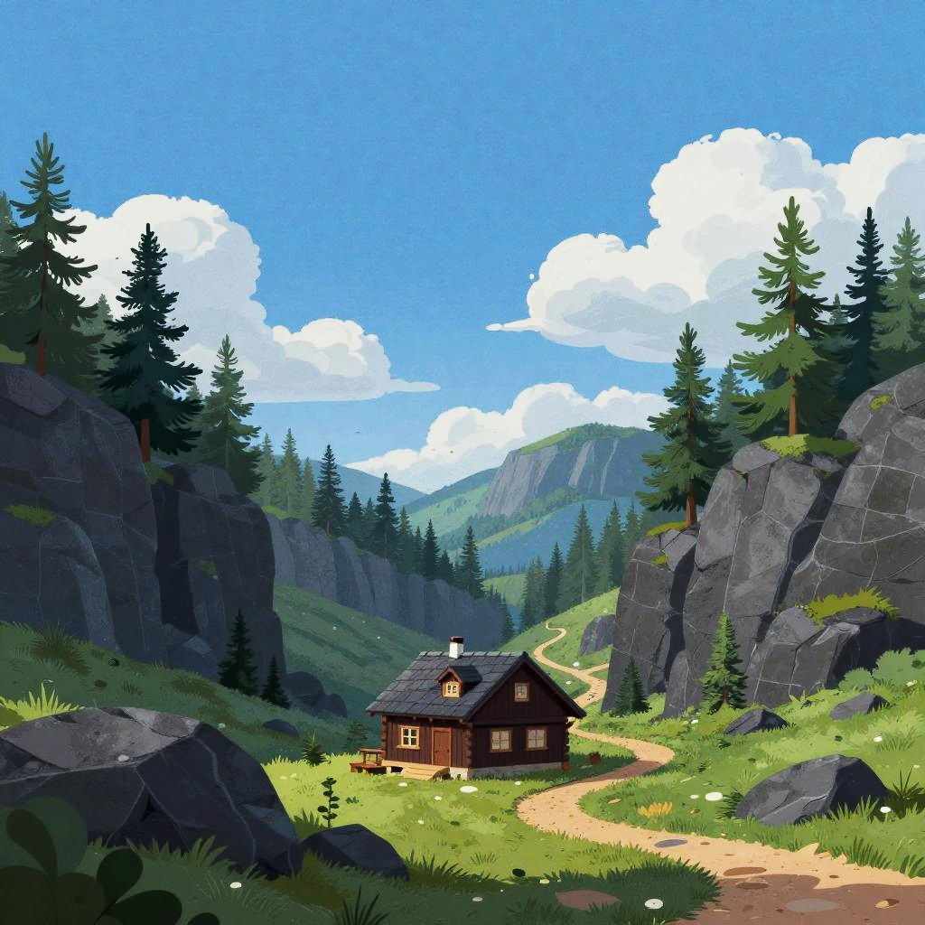 Digital illustration of autumn forest clearing, with rust-red leaf-carpeted low rises surrounding a small brick cottage at the center. Deep blue sky with soft, fluffy clouds, tall dark-green trees scattered across the slopes. A winding path curls toward the home, tiny birds drift overhead. Vibrant, whimsical mood, storybook charm, crisp edges, matte textures, subtle grain, balanced composition, high detail, wide view, inviting atmosphere.