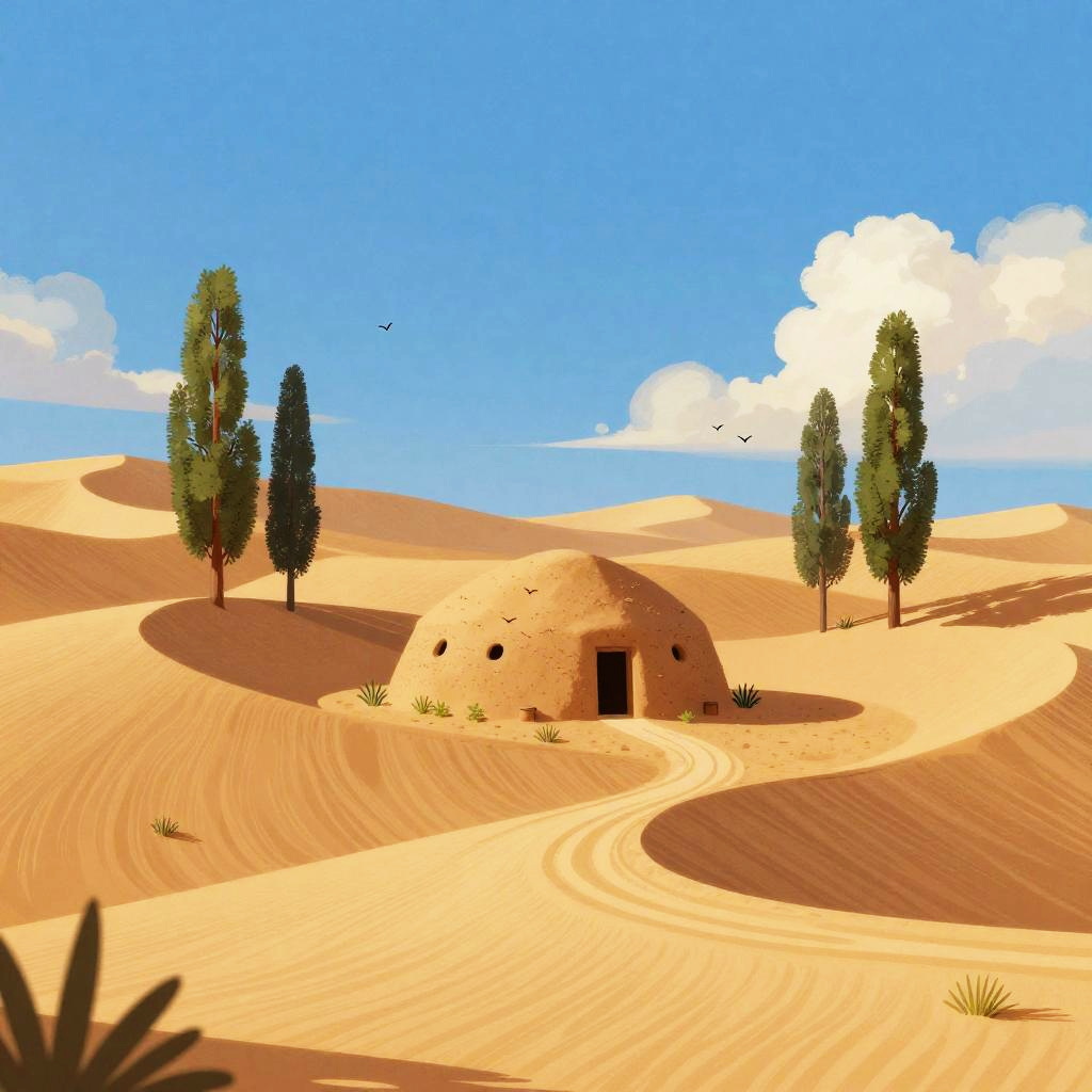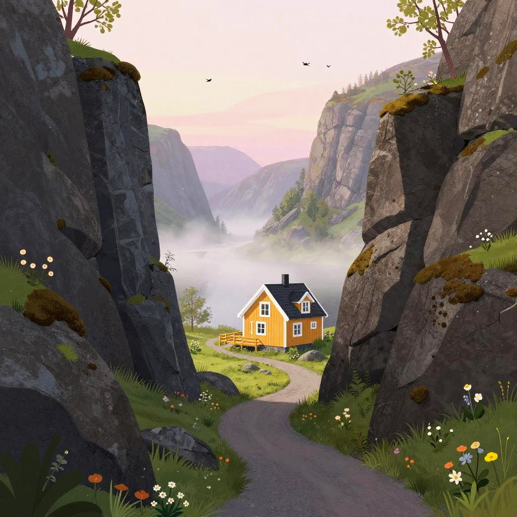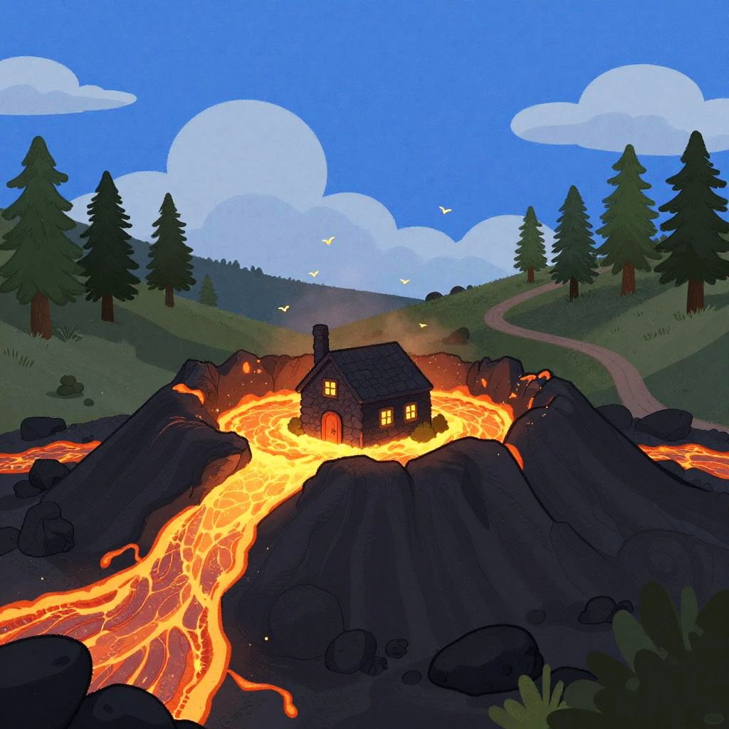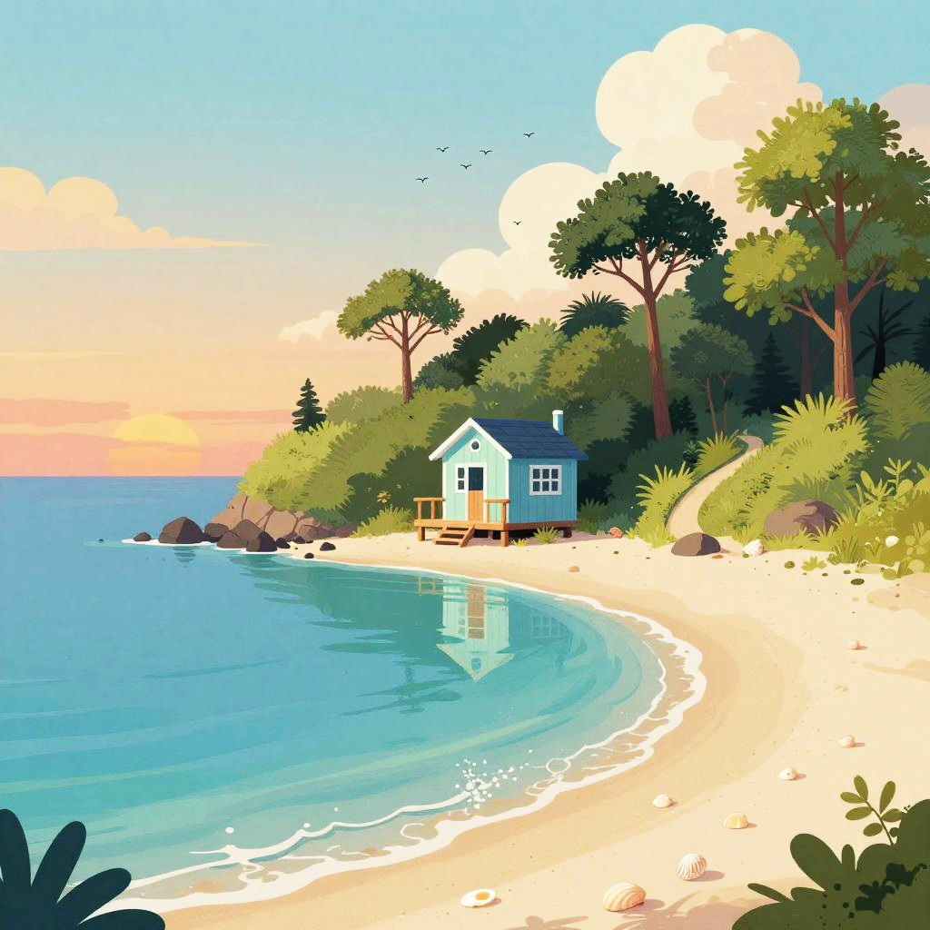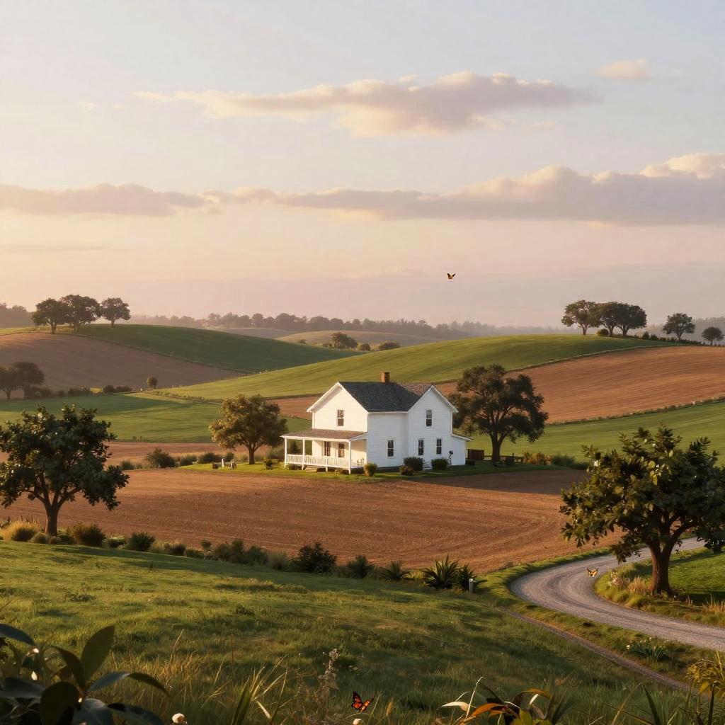 Digital illustration of autumn forest clearing, with rust-red leaf-carpeted low rises surrounding a small brick cottage at the center. Deep blue sky with soft, fluffy clouds, tall dark-green trees scattered across the slopes. A winding path curls toward the home, tiny birds drift overhead. Vibrant, whimsical mood, storybook charm, crisp edges, matte textures, subtle grain, balanced composition, high detail, wide view, inviting atmosphere.