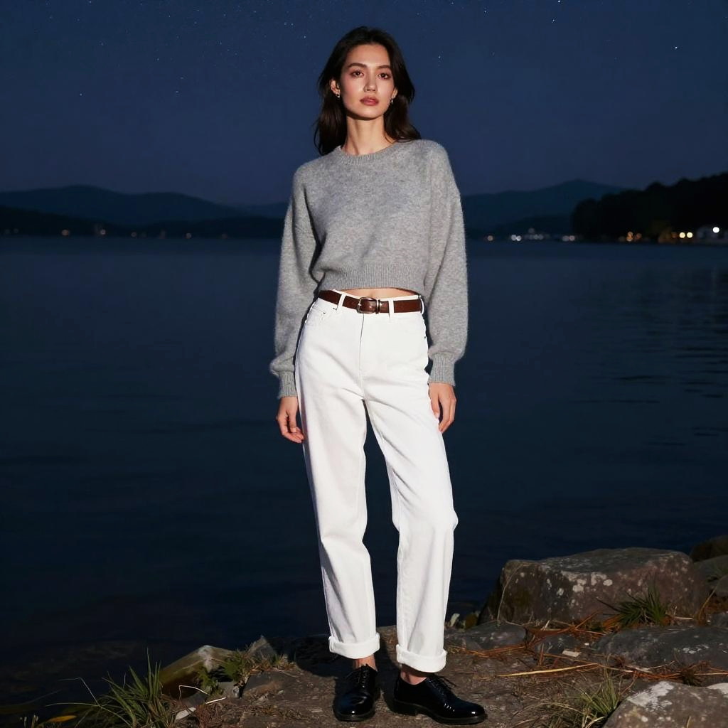 A woman in a minimalist cropped gray sweater and white high-waisted trousers stands by the lake, embodying a production IG visual style. She wears a brown thin belt and black patent leather oxfords, creating a chic yet relaxed look as she gazes at the stars. Sexy. Pretty face and beutiful eyes