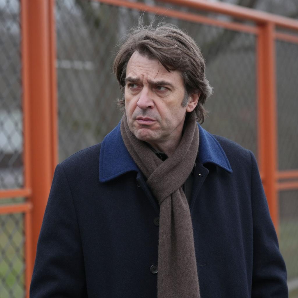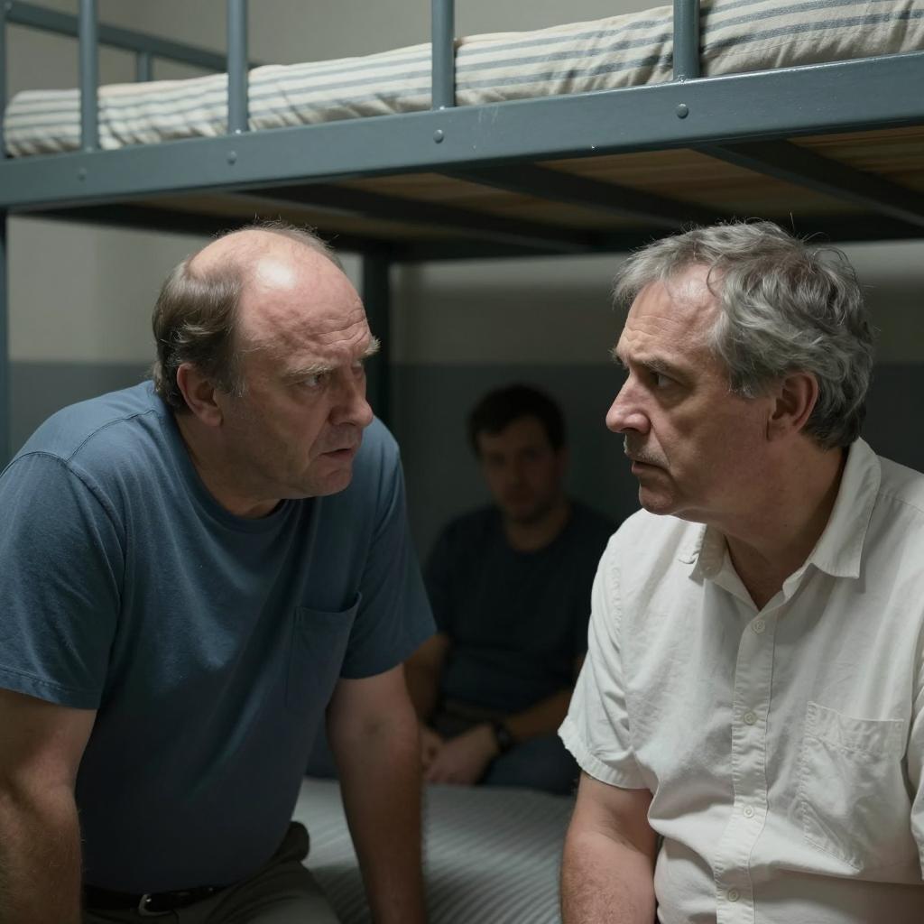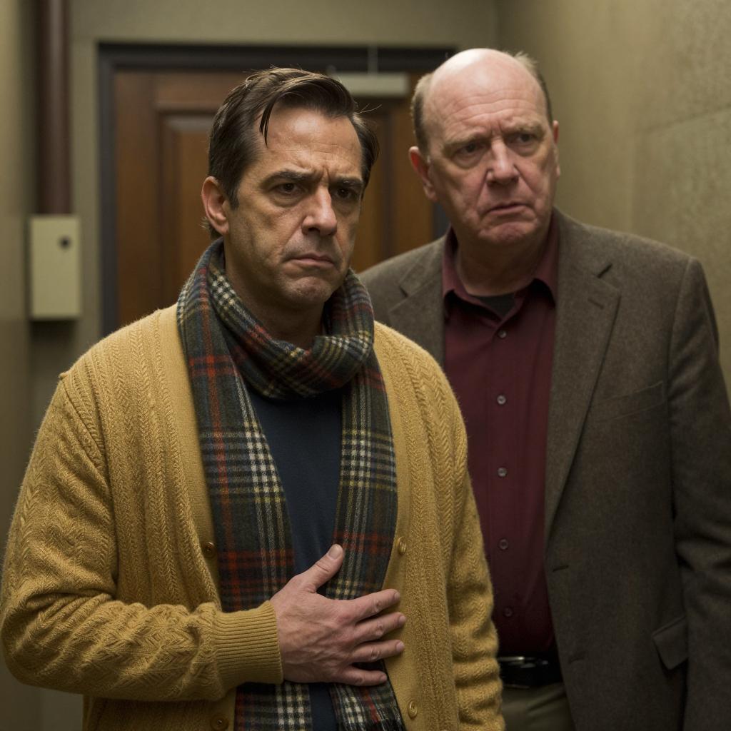 Two middle-aged men in an indoor setting. The man on the left has short dark hair, white shirt, black suspenders, and a serious expression. The man on the right has dark hair, glasses, beard, plaid shirt, and looks down while holding a cigarette. Map in the background.