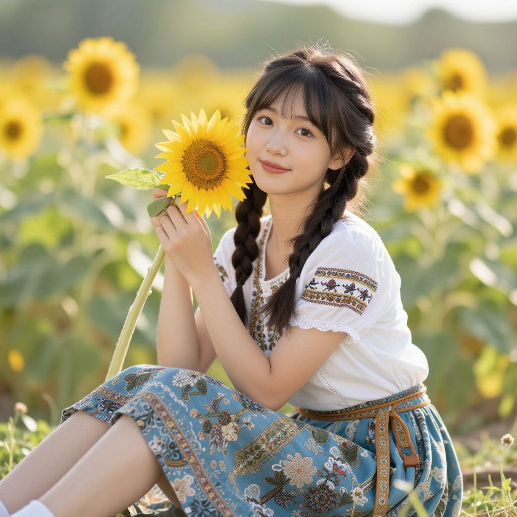 Photograph of an East Asian woman with long black hair in two braids, wearing a white short-sleeved blouse with embroidered patterns and a blue floral skirt, sitting in a sunlit sunflower field. She holds a bright yellow sunflower close to her face, smiling softly. The background is a blur of more sunflowers, with sunlight creating a warm, golden glow. The woman's skin is light, and she has subtle makeup. The image has a natural, serene feel, with the woman's traditional yet casual attire adding a touch of cultural charm.