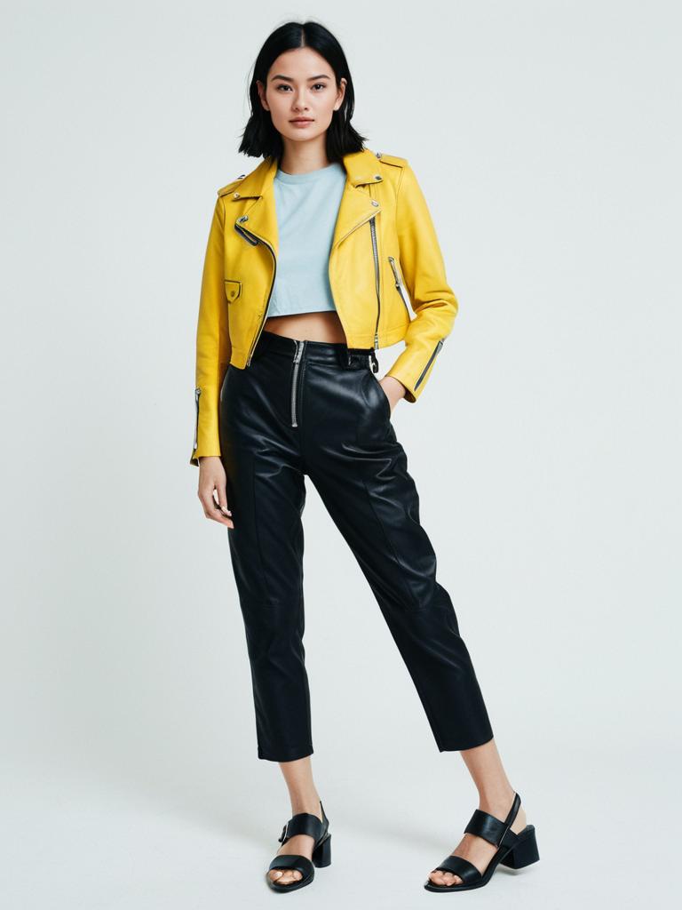 Woman, contemporary street style, bright yellow leather biker jacket with asymmetric zipper and silver hardware, light blue casual T-shirt underneath, high-waisted cropped black trousers, black flat mules with pointed toes, simplistic makeup, plain white studio background. --sref 1404