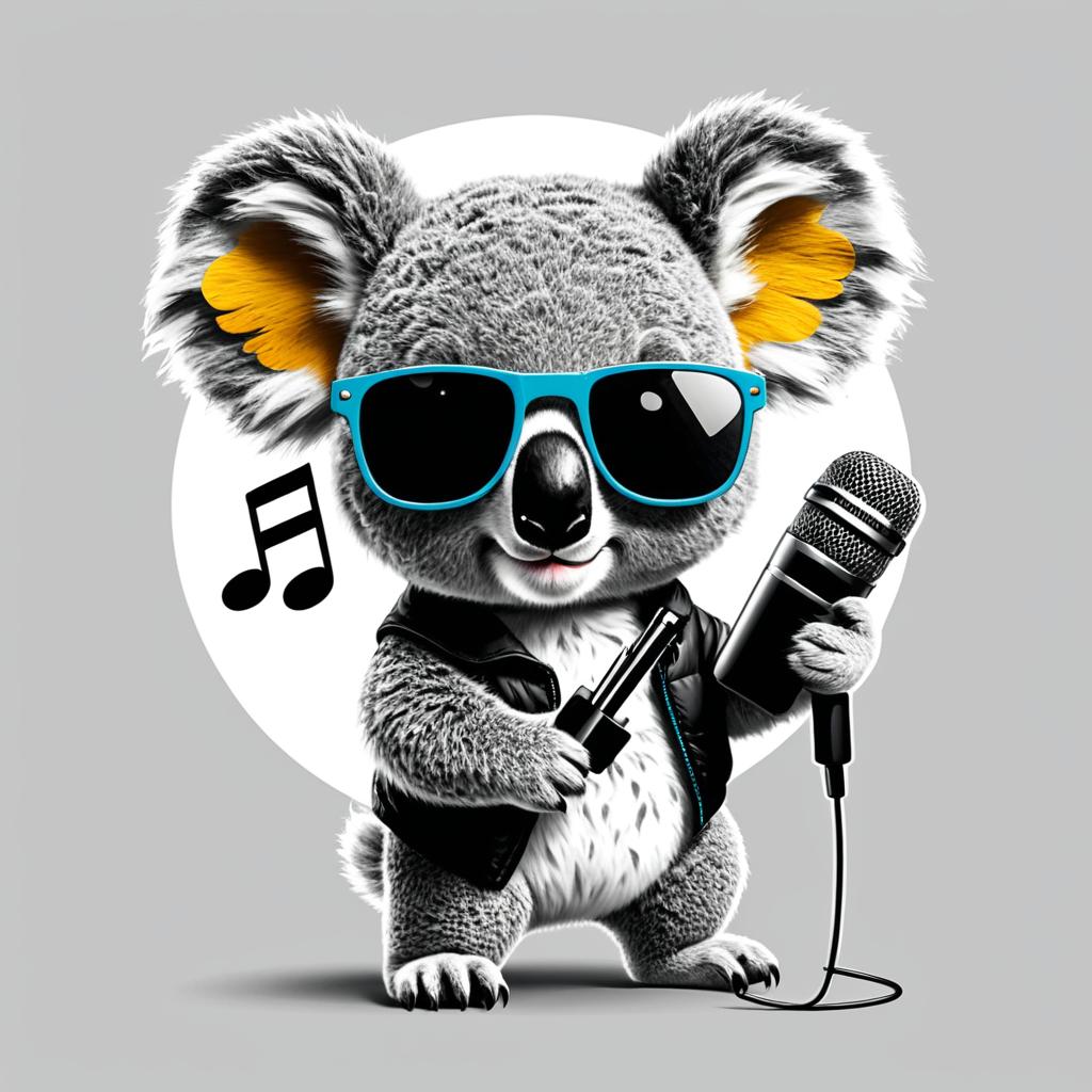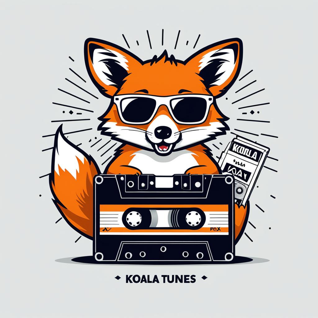 Logo of a cute cartoon fox with sunglasses holding a cassette tape, playful with a sound wave icon, bold colors, for a brand named Koala Tunes.
