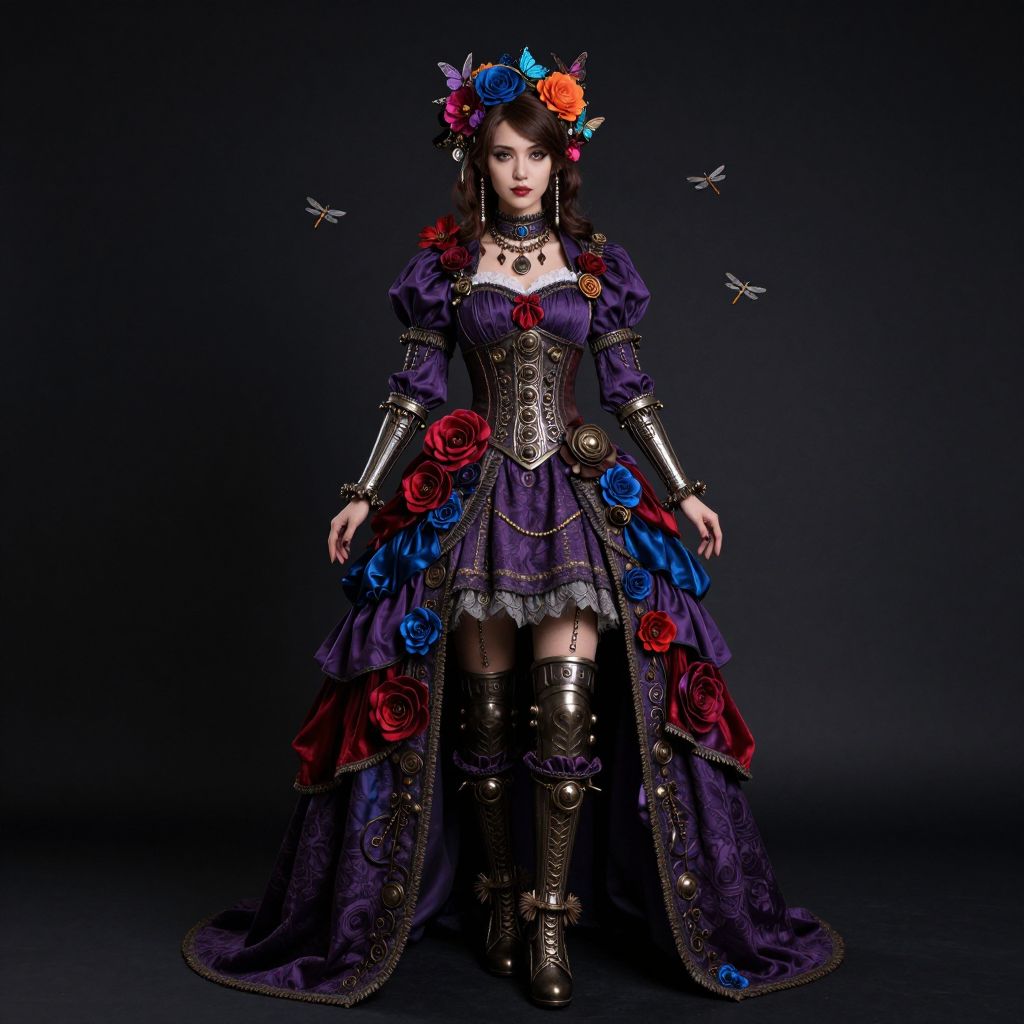 The image depicts a steampunk lady full body, adorned in a rich, intricate ensemble of purple, red, and blue hues. Her attire is detailed with metallic accents and floral embellishments, creating a striking contrast against the dark background. The woman's hair is adorned with vibrant flowers and butterflies, adding a whimsical touch to her appearance. Dragonflies flutter around her, enhancing the ethereal and fantastical atmosphere. The overall composition is balanced, with the woman centrally positioned, and the elements of her outfit and accessories arranged in a harmonious manner, creating a visually captivating scene.