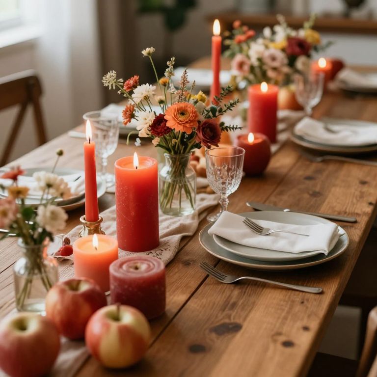 A bohemian tablescape featuring a rustic wooden table adorned with vibrant red-orange candles, delicate floral arrangements, and fresh apples, captured in high-definition detail with warm, inviting lighting that enhances the earthy tones and natural textures.