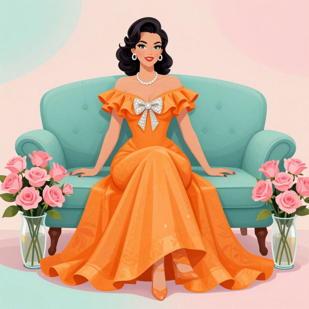 A vibrant digital illustration by Janet Hill, showcasing a vintage glamour style, features a woman elegantly seated on a teal sofa, adorned in a flowing orange gown with off-the-shoulder ruffles and a sparkling bow, surrounded by lush pink roses in a glass vase against a pastel backdrop.