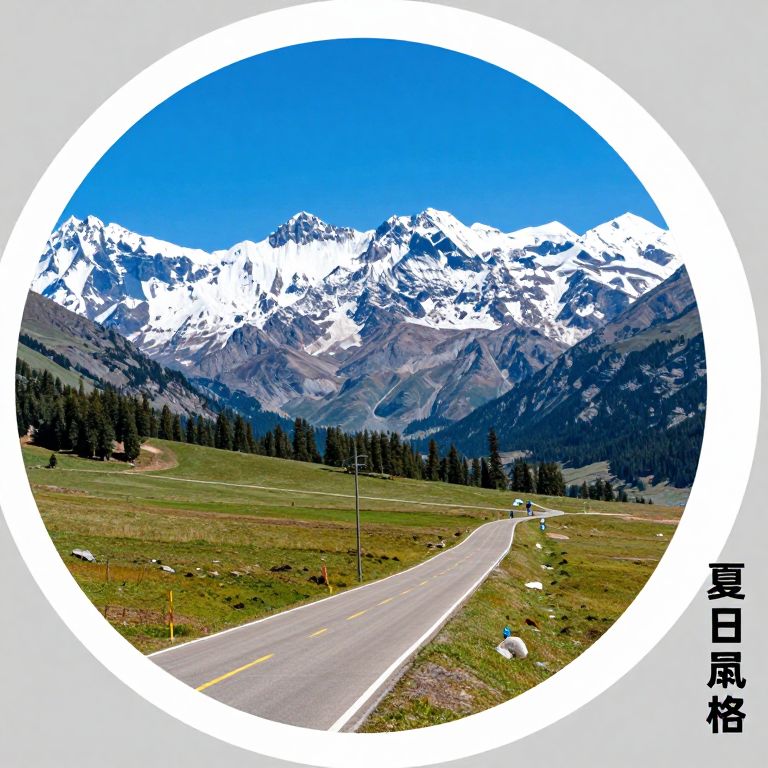 This is a colorful photograph of a mountainous landscape. Snow-capped peaks dominate the background under a bright blue sky. A winding asphalt road runs through a grassy meadow with scattered trees. Two tiny blue figures are visible in the distance, adding scale. The image has a circular white overlay in the center and a gray border with text on the right side.