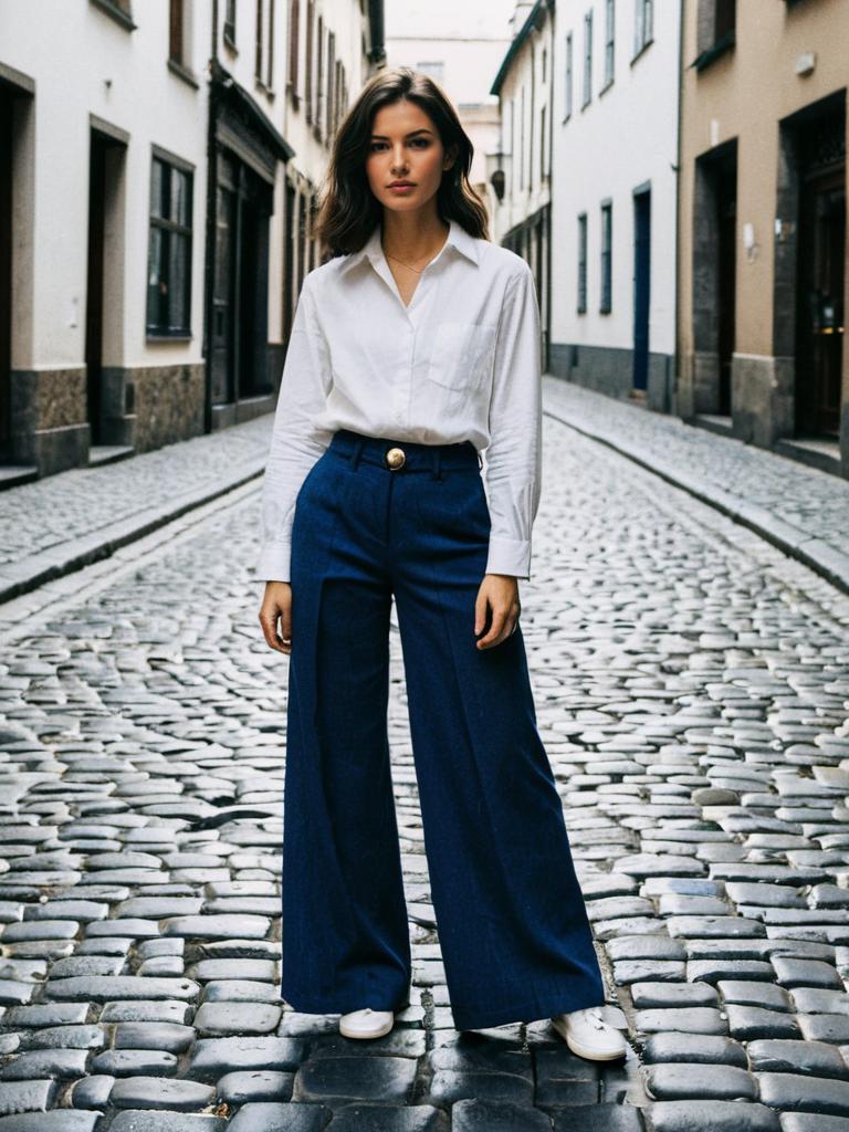 Exclusive Fashion Wear, woman in grey coat and white pants standing on cobblestone street
