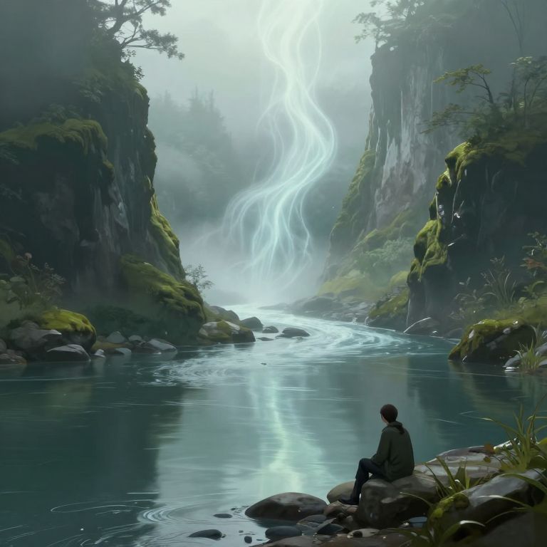 A solitary figure sits atop a craggy cliff in a serene yet hauntingly beautiful digital painting, overlooking an expansive otherworldly landscape reminiscent of dreamlike settings. The perspective shifts to reveal a hidden vantage point nestled within the cliff face, offering an intimate glimpse into this individual's introspective state as they gaze at the horizon. Amidst a vibrant color palette featuring muted blues and earthy greens, soft light illuminates their enigmatic silhouette, evoking a sense of solitude and contemplation against the backdrop of a breathtakingly surreal yet familiar landscape.