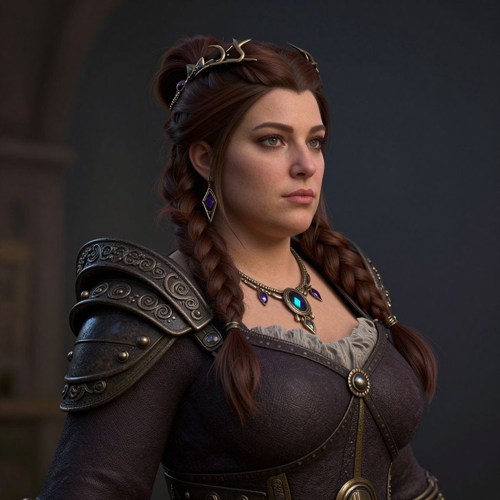 Digital art of a strong, fair-skinned elven woman with braided blonde hair, wearing a leather crop top and skirt, standing by a river