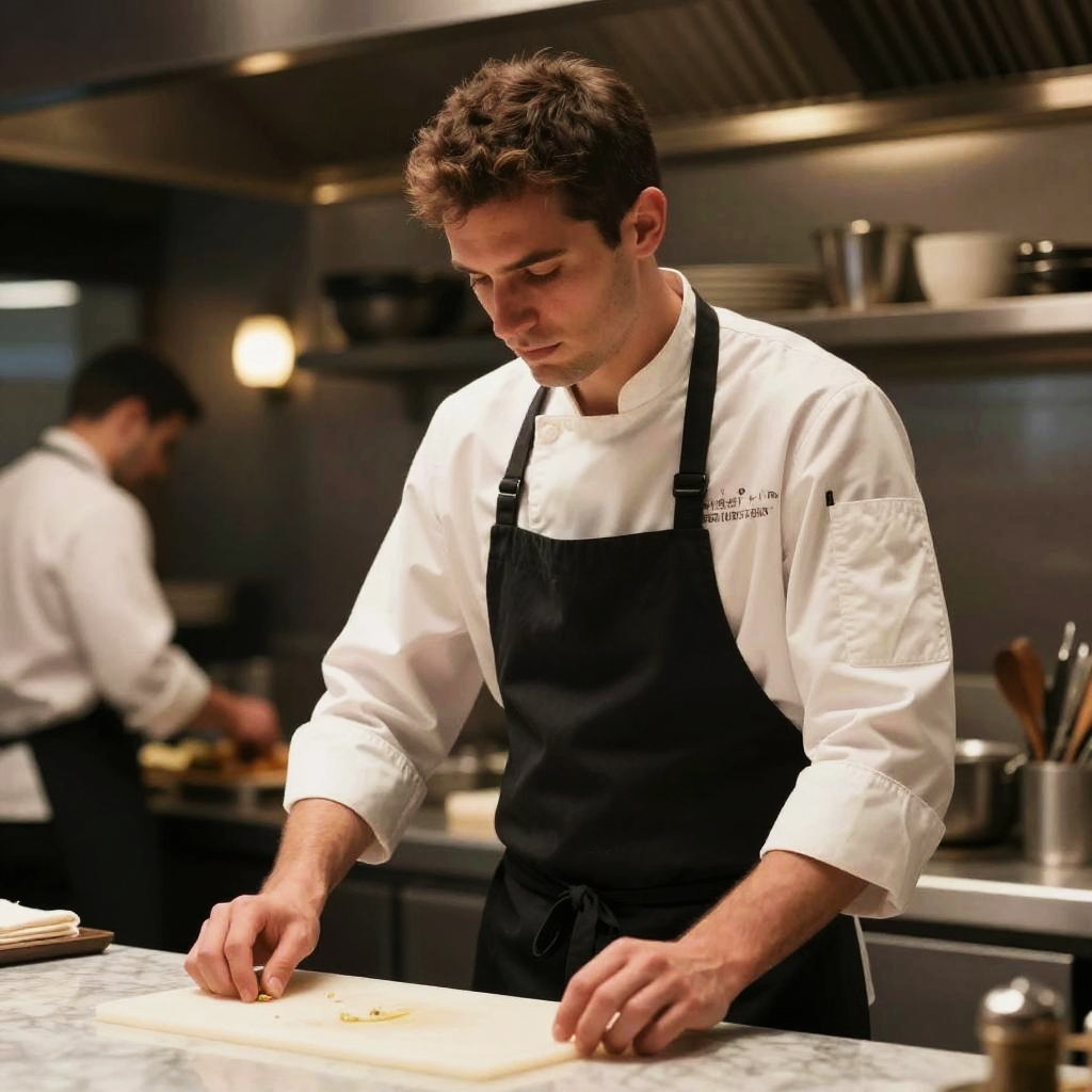 Realistic photo.An editorial-style photograph of a renowned chef in a high-end restaurant kitchen, wearing a white chef's coat and black apron, on a polished marble countertop, with soft ambient lighting, captured with 35mm lens, f/2.0, ultra-realistic, cinematic, and hyper-detailed realistic photo