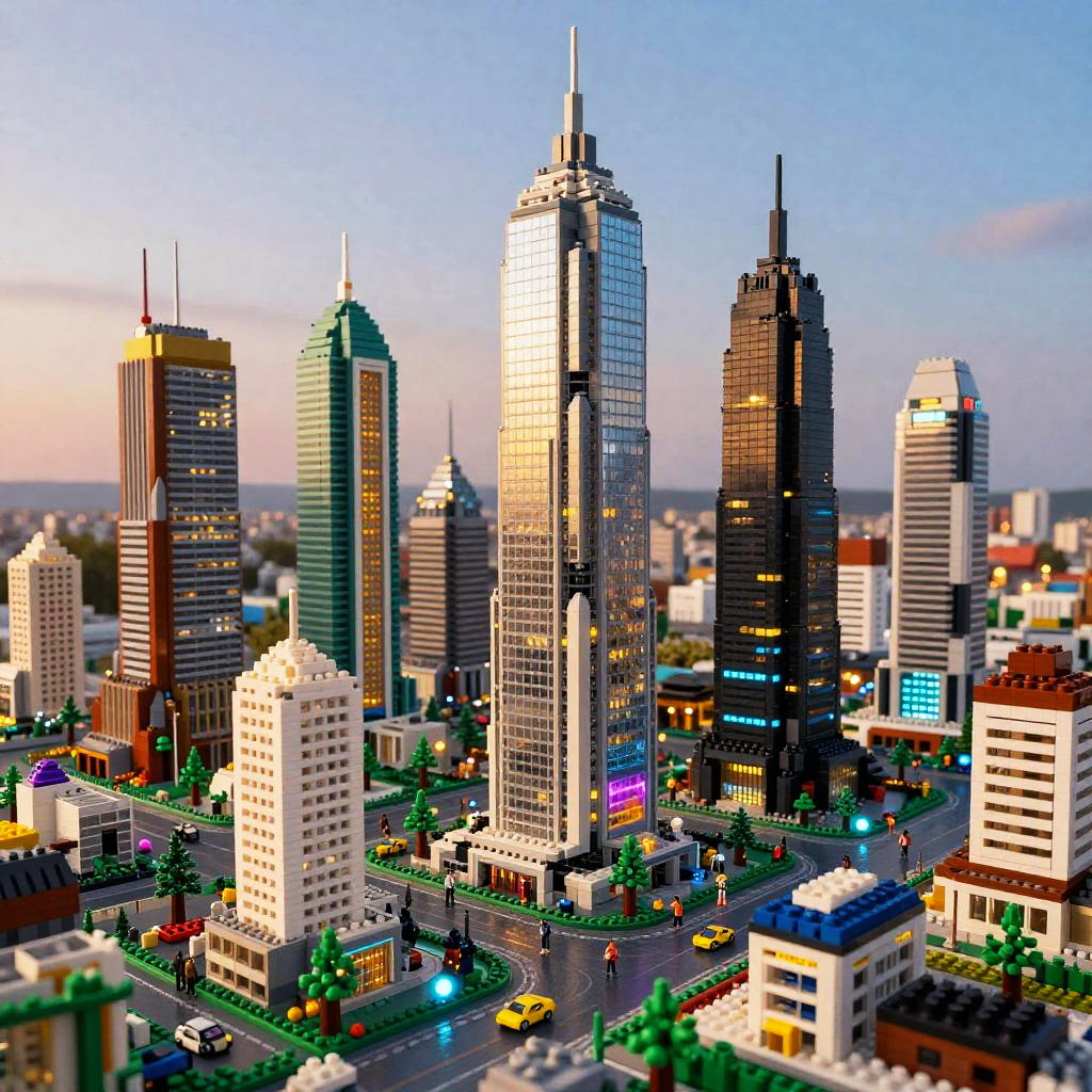 A futuristic cityscape constructed entirely from Legosteine, illuminated by neon lights at dusk, intricate miniature structures with tiny figures interacting, high-resolution digital art, imaginative and colorful, dynamic composition.