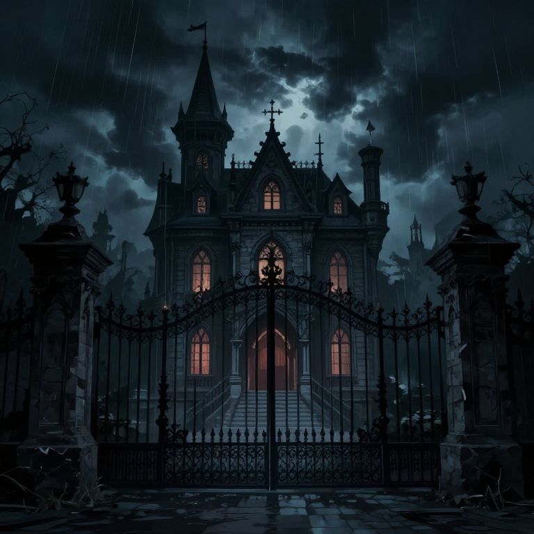 "Display an urban fantasy book illustration, concept art, gothic mansion, wrought iron gate, stormy night sky, background only,"