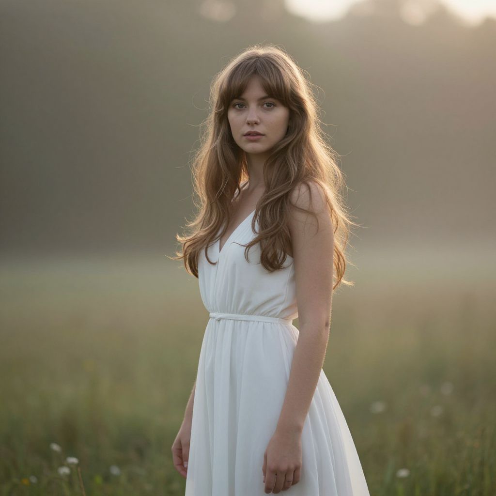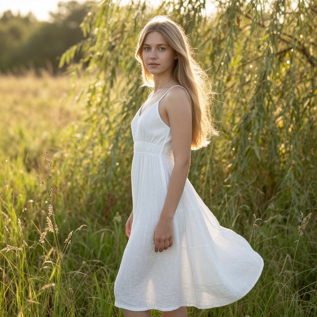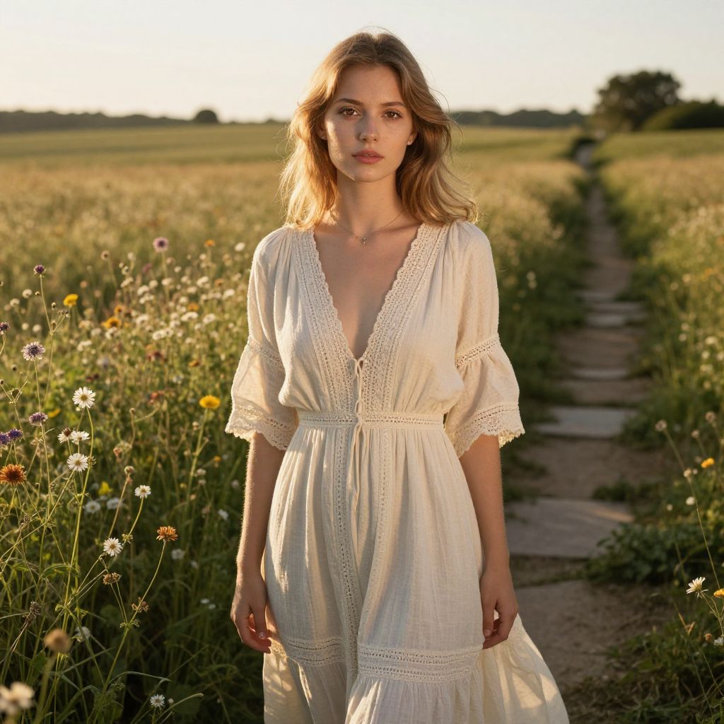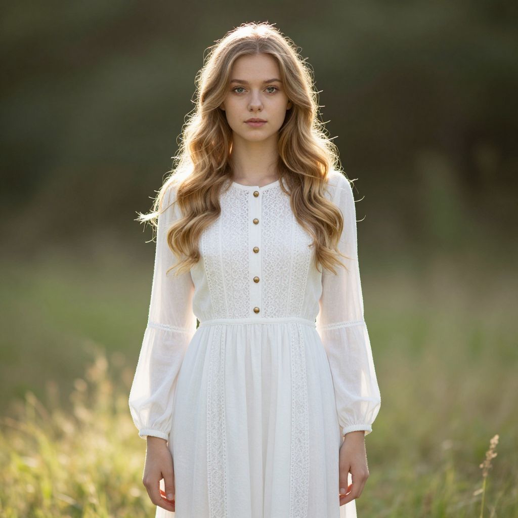 Photograph of a young woman standing in a sunlit, grassy field. She has long, wavy blonde hair and fair skin. She's wearing an elegant, white, long-sleeved dress with intricate lace and gold buttons down the center. The background is softly blurred with green foliage, highlighting her as the focal point. The sunlight creates a gentle glow around her, adding a dreamy, ethereal vibe.