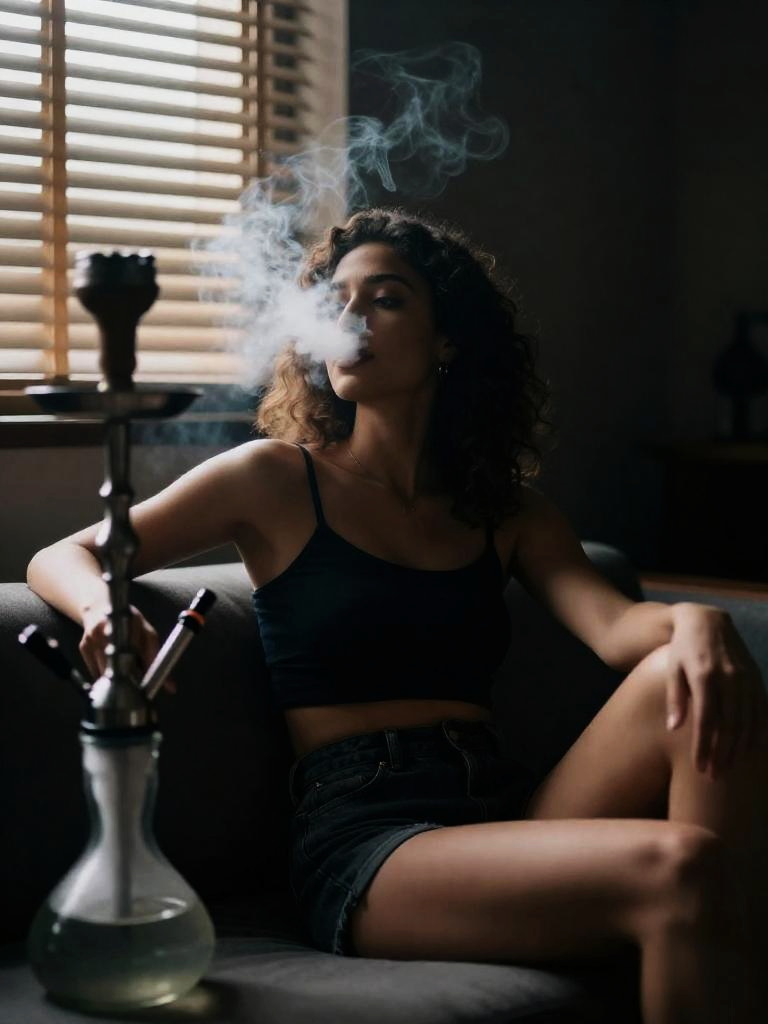 Fair-skinned woman with loose curly hair sitting on a low couch, smoking shisha. She wears a dark crop top and high-waisted shorts. The image features a sleek vape-style hookah with dense smoke partially obscuring her face. Shot indoors with dramatic lighting highlighting venetian blinds casting slivers of light in a moody nighttime setting.