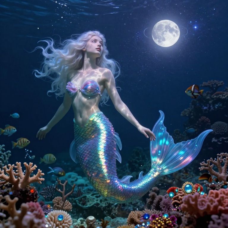 A portrait of an enchanting celestial mermaid with shimmering scales reminiscent of dreamlike paintings, her flowing hair cascading like ribbons of cosmic light. She stands gracefully on an ancient weathered pier extending into infinity as she gazes at a vibrant starry sky, casting ethereal reflections onto the rippling water below. The surrealism of melting clocks is replaced by an abstract fusion of colors and shapes, evoking a sense of wonder and timelessness in this whimsical scene.