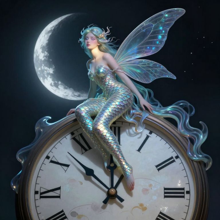 Digital art: Silver mermaid with flowing hair sits on wooden dock, gazing at floating clock against starry, cosmic night sky.