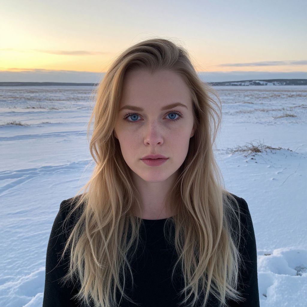 Photograph of a blonde woman with blue eyes, wearing a black top, standing in a snowy landscape at sunset.