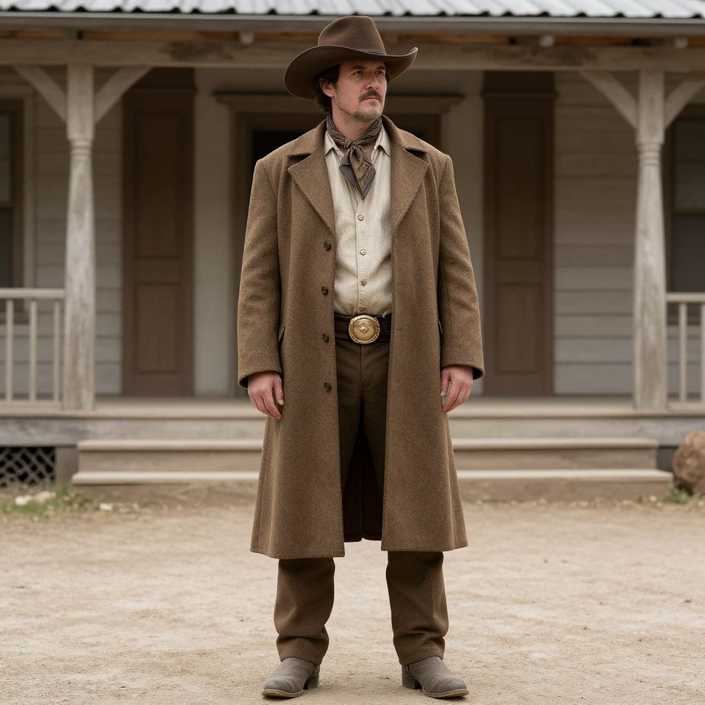 Old Western Cowboy Costume, man in a brown hat and long coat standing in front of a building